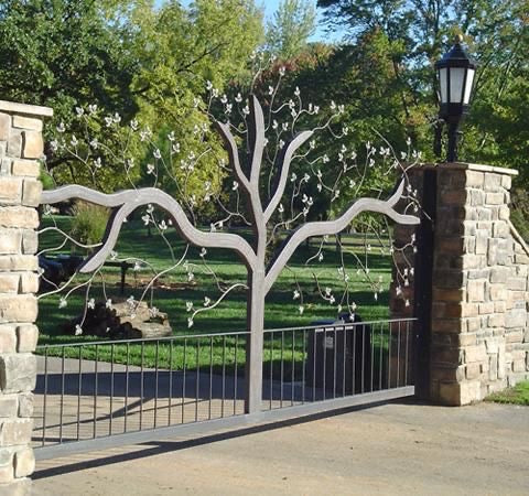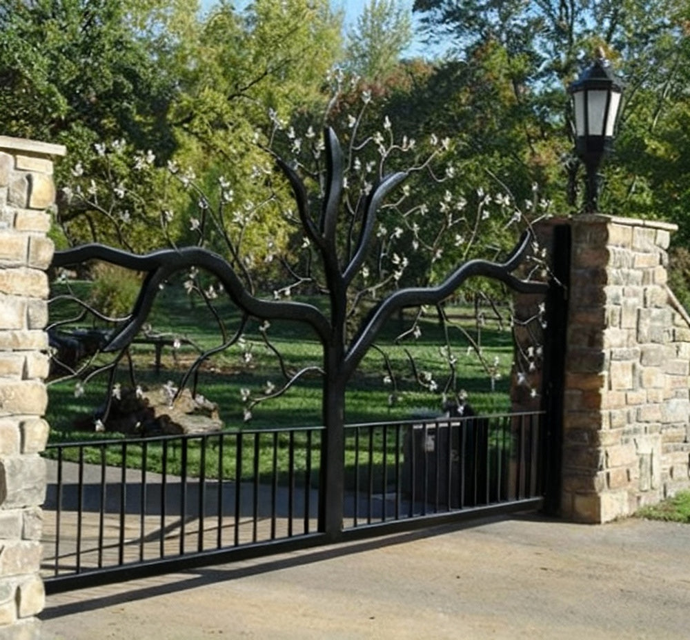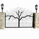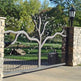tree silhouette driveway gate, nature-inspired wrought iron gate, custom steel entrance gate, Canadian artistic gate, garden estate gate, heavy-duty decorative gate, Taimco driveway gate, outdoor sculptural gate, stylized tree gate design