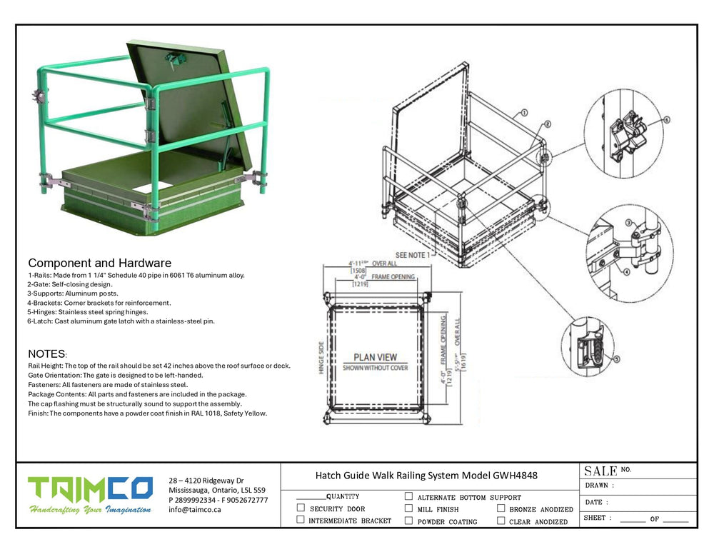 Thermally Broken Roof Hatch, Roof Hatch Safety Railing System, TAIMCO GWH4848, Ladder Access Roof Hatch, Fall Protection System, Energy-Efficient Roof Hatch, Self-Closing Gate, Aluminum Alloy Rails, Stainless Steel Fasteners, Safety Green Powder Coat, 36x30 Thermally Broken Roof Hatch Safety Railing, Customizable Roof Hatch Safety Solutions, High-Visibility Roof Hatch Safety Railings, Durable Roof Hatch Safety Systems for Commercial Buildings, Energy-Efficient Fall Protection for Roof Hatches