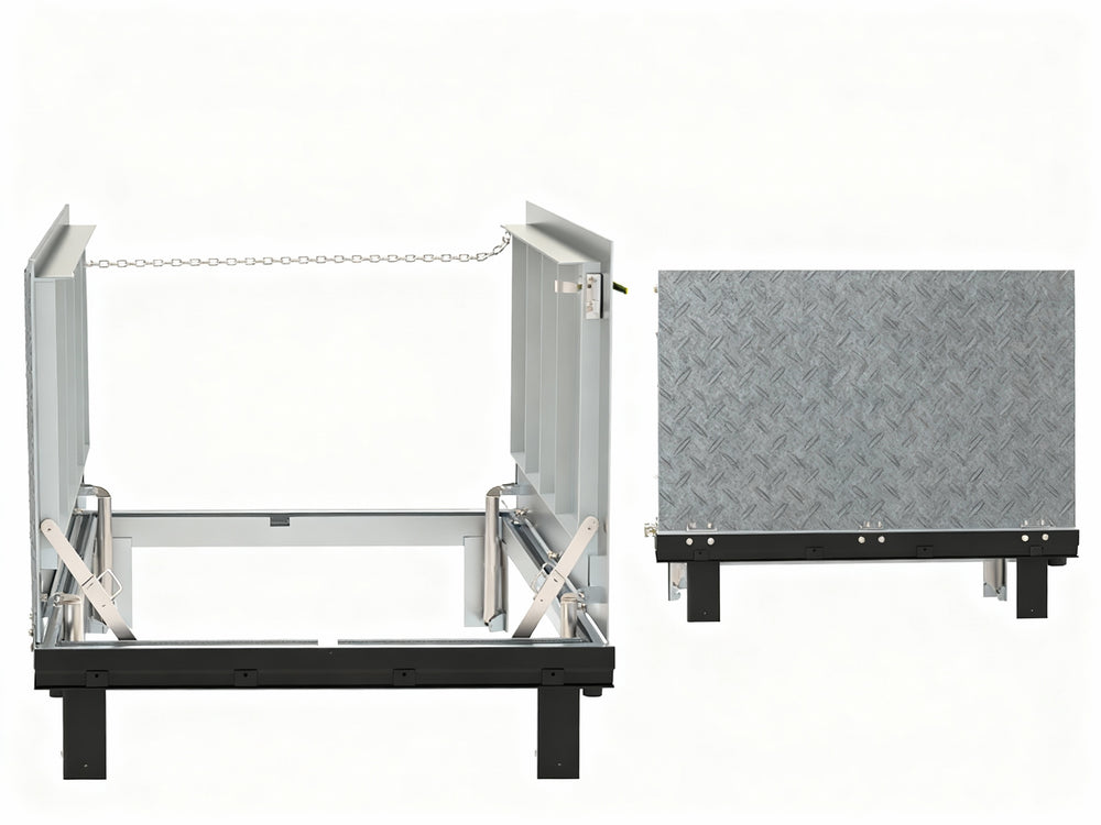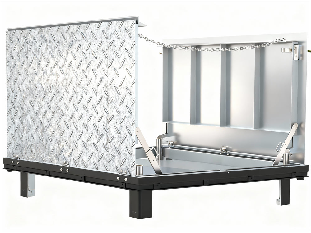 - Cover: Diamond-pattern tread plate, reinforced for 300 PSF live load
