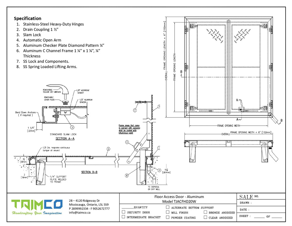 Crafted from corrosion-resistant aluminum and reinforced to withstand 300 PSF live loads, the TJACFHD20W combines durability, security, and ease of operation. With 316 stainless steel hardware, engineered lift assistance, and a positive latching mechanism, this access solution delivers uncompromising performance for architects, contractors, and facility managers seeking premium quality.