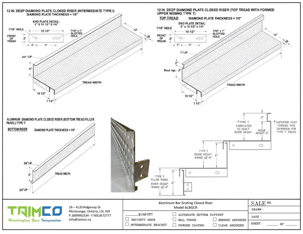 TAIMCO, aluminum I-bar, bar grating treads, corrugated nosing, skid-resistant, self-cleaning, economical, durable, Closed riser staircase, lightweight aluminum, customizable tread depths, safe stair treads