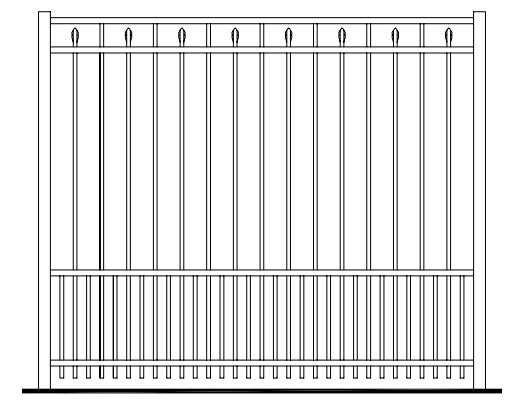 The fence has finials straight across the top extending above the top rail. All heights have three rails.