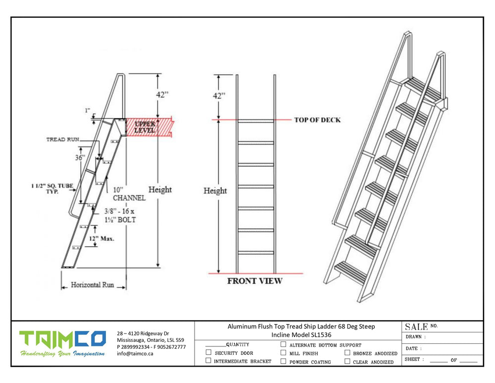 Aluminum Flush Top Tread Ship Ladder 68 Deg Steep Incline Model SL1536