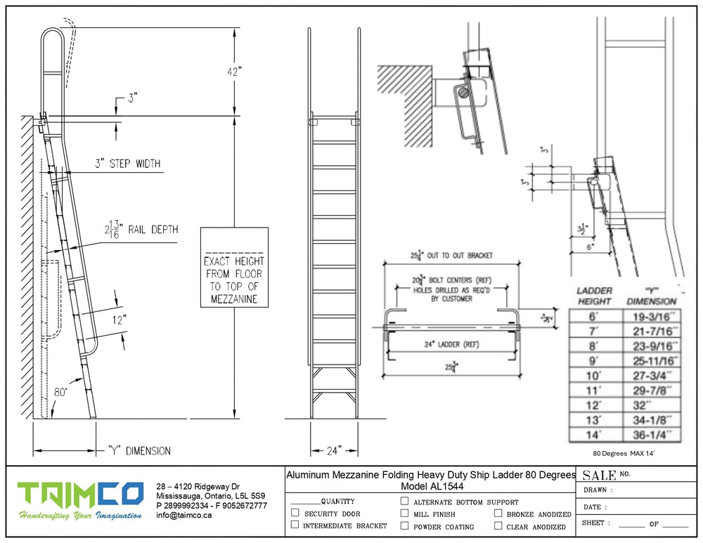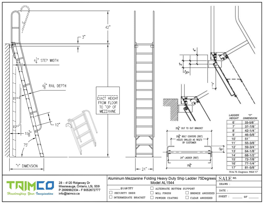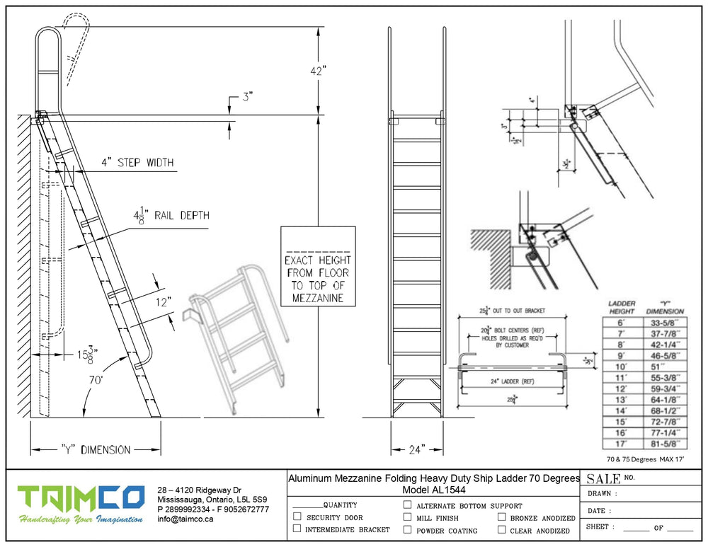 Taimco AL1544 ship ladder, OSHA-compliant aluminum ship ladder, Heavy-duty industrial access stairs, Space-saving ladder design, Durable aluminum mezzanine ladder.