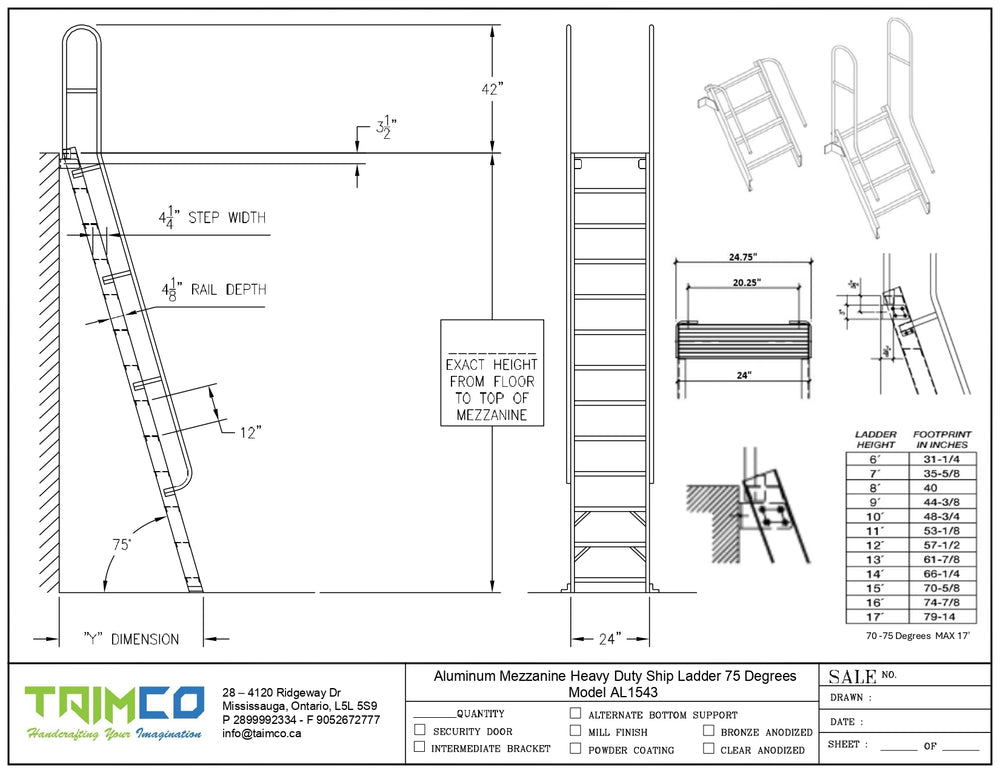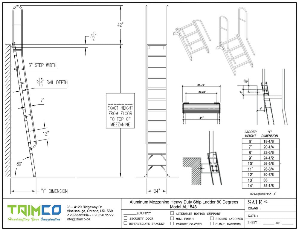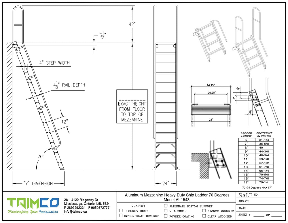Taimco AL1543 ship ladder, OSHA-compliant aluminum ship ladder, Heavy-duty industrial access stairs, Space-saving ladder design, Durable aluminum mezzanine ladder.