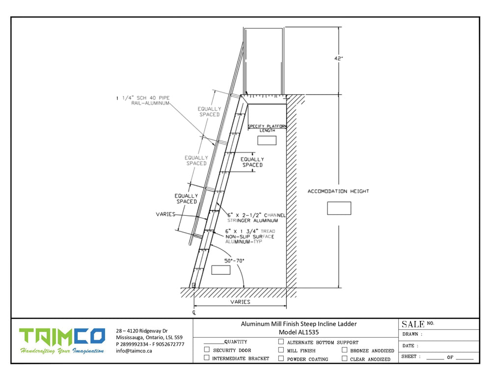 Taimco AL1535 Welded Aluminum Ships Ladder - 50-70° Steep Incline