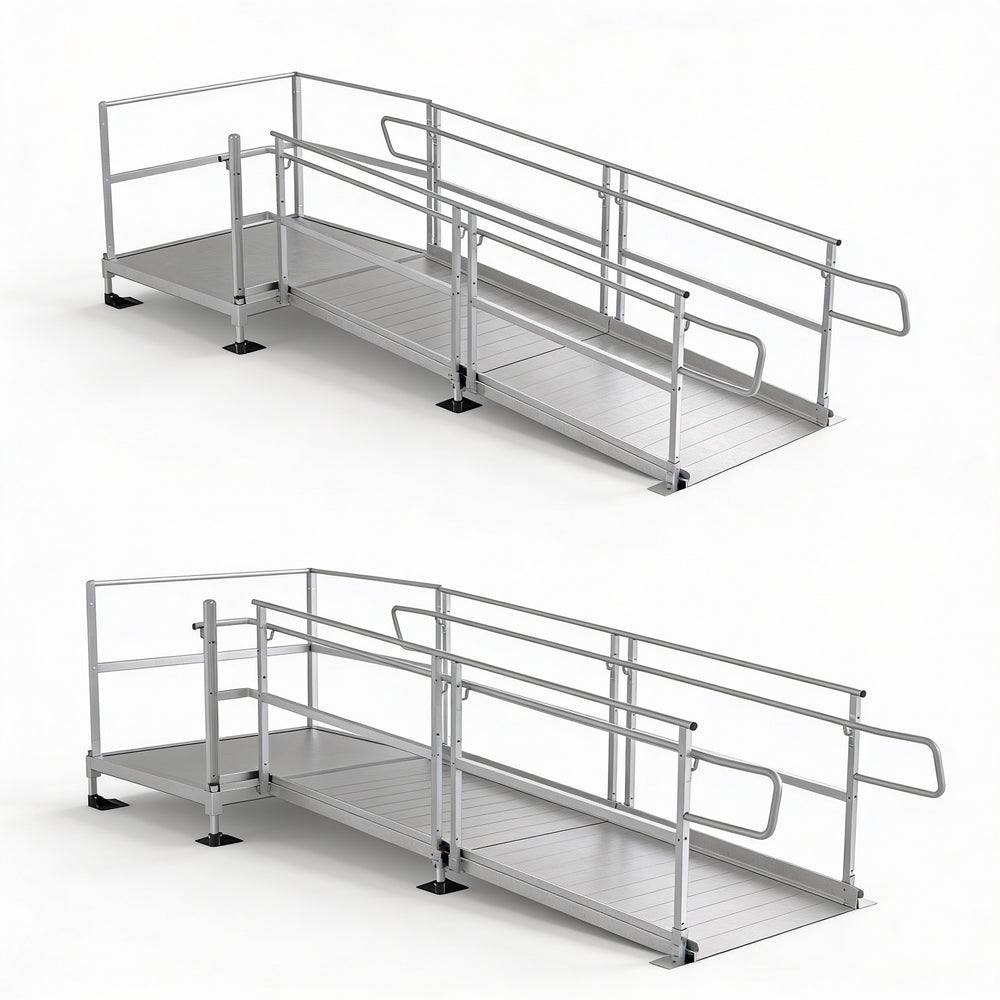 - Configurations: Standard kits offer a choice of 16 ramp lengths ranging from 6 feet to 36 feet. Each kit includes a 5’x5’ landing platform, picketed handrails, end loops, legs, and feet.