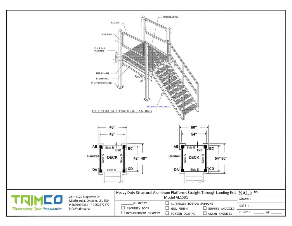 - Experience unparalleled durability with Taimco AL1531 aluminum stair landings, designed for customizable size and configurations. Achieve seamless bolt-together assembly with heavy-duty platforms tailored for any space constraint. Perfect for industrial, commercial, and residential applications, these stair landings are your reliable solution for maximizing floor space. Get same-day price quotes and detailed assembly instructions today!