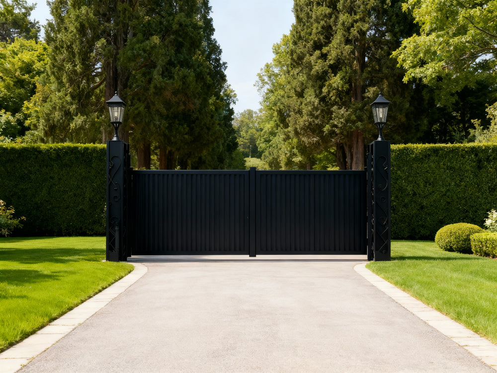 Vertical slat metal gate, ornamental pillar driveway gate, residential estate entrance, Canadian custom gate, Taimco lantern gate, classic wrought iron gate design