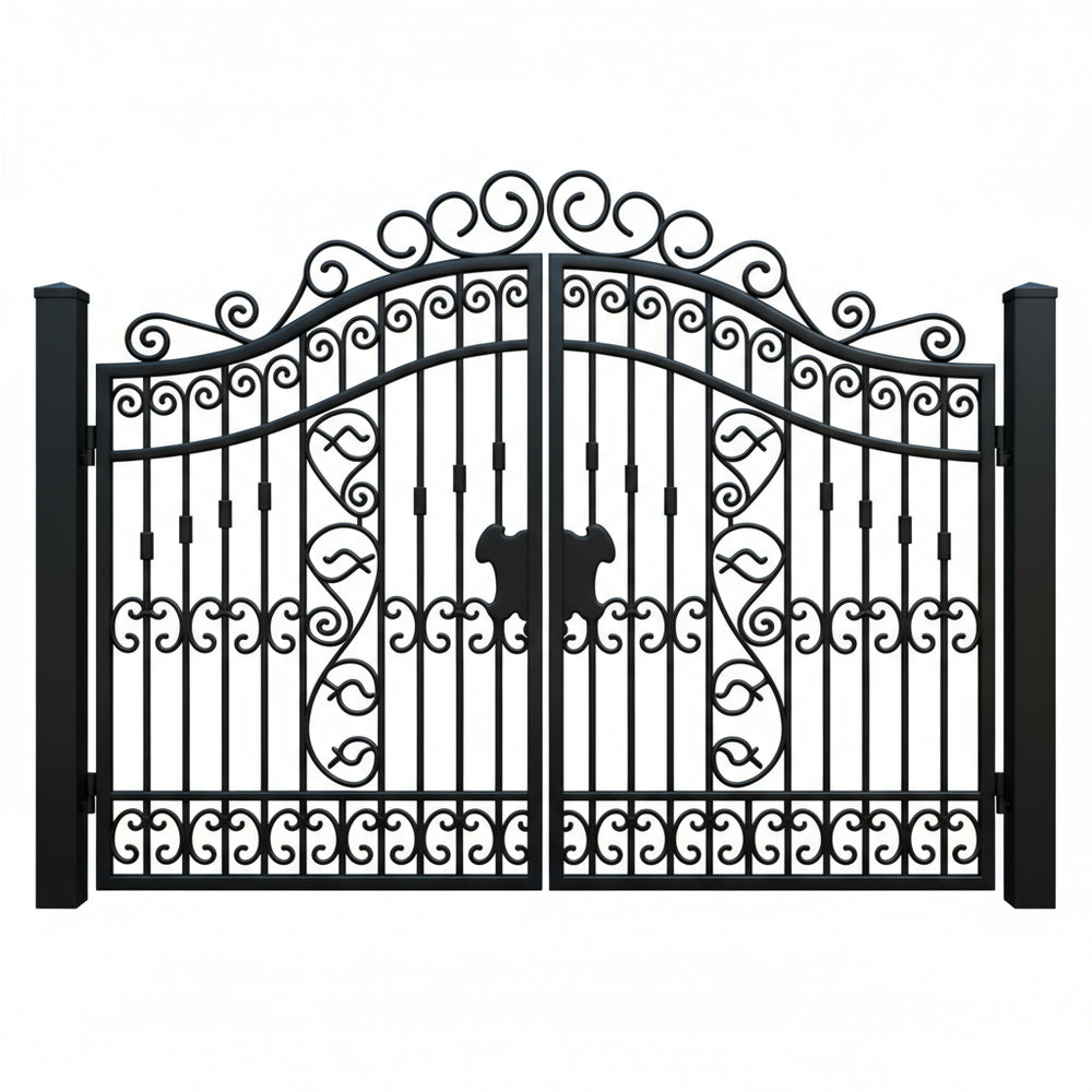 A gate that curves with confidence. Archeline Scroll features dual swing panels with vertical bars interspersed by ornamental scrollwork, crowned by an arched top rail adorned with swirling flourishes. The symmetrical layout and matte black finish create a classic silhouette, while the sturdy black pillars provide structural balance and visual grounding. Ideal for properties that blend traditional craftsmanship with modern durability.
