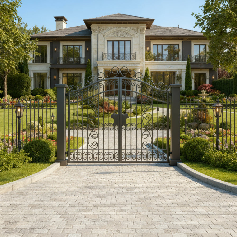 arched scrollwork driveway gate, ornamental wrought iron gate, custom steel entrance gate, Canadian luxury gate, Taimco decorative gate, vertical bar estate gate, heavy-duty artistic gate, formal home gate design