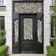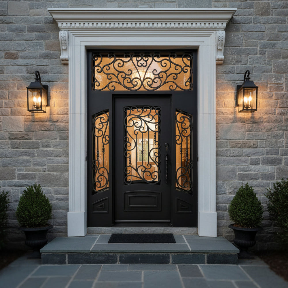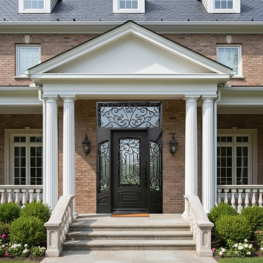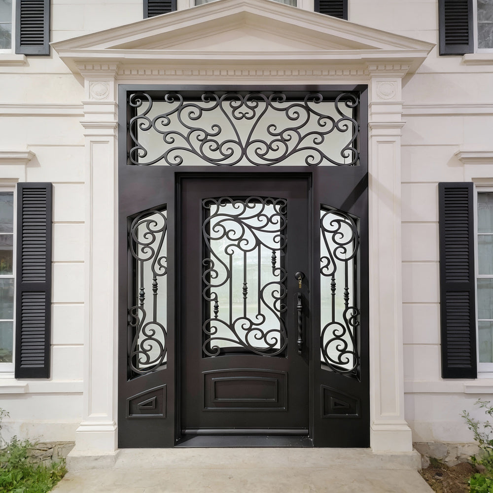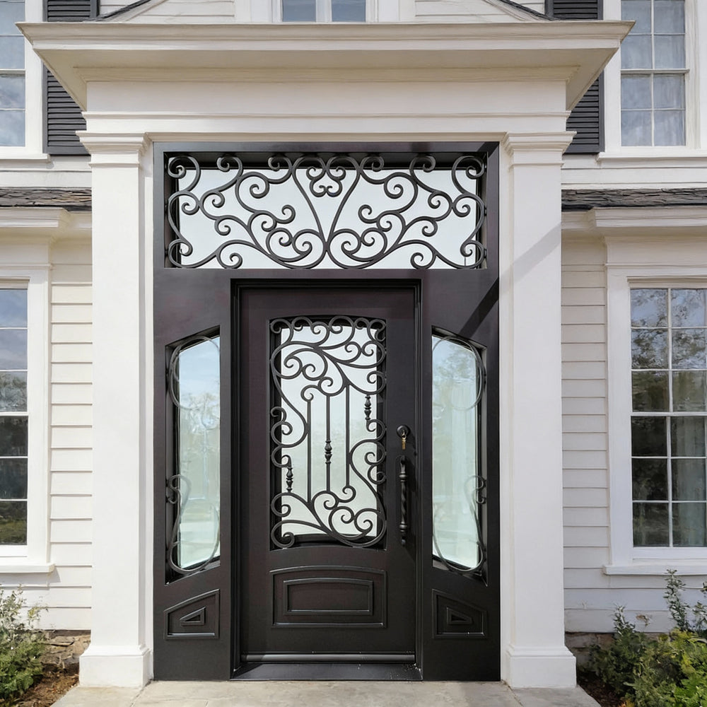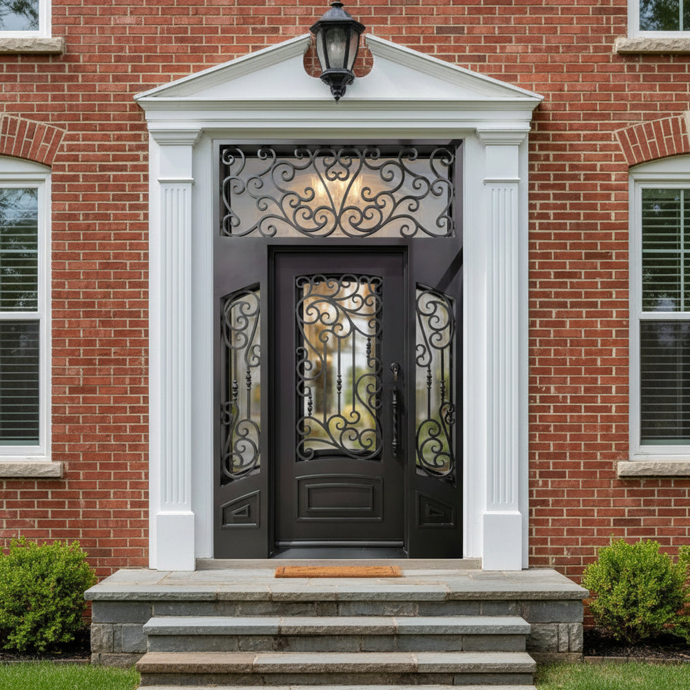 Statement entrance featuring twin steel doors crowned with an arched transom, all embellished with symmetrical wrought iron scrollwork. The intricate curves evoke timeless European design, while the matte black finish and strong steel frame ensure durability and security.