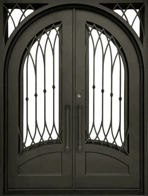 Model IWD 967 blends classic lattice geometry with ornamental scroll flourishes for a timeless wrought iron entryway. With an arched frame, matte black finish, and symmetrical double-leaf design, this handcrafted door offers both strength and style. Fully customizable and insulated for seasonal performance, it suits heritage-inspired homes, luxury renovations, and builds that prioritize architectural presence.
