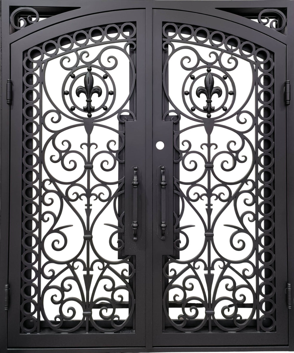 Arched Wrought Iron Double Door with Fleur-de-Lis Scrollwork and Bronze Finish – Model # IWD 980