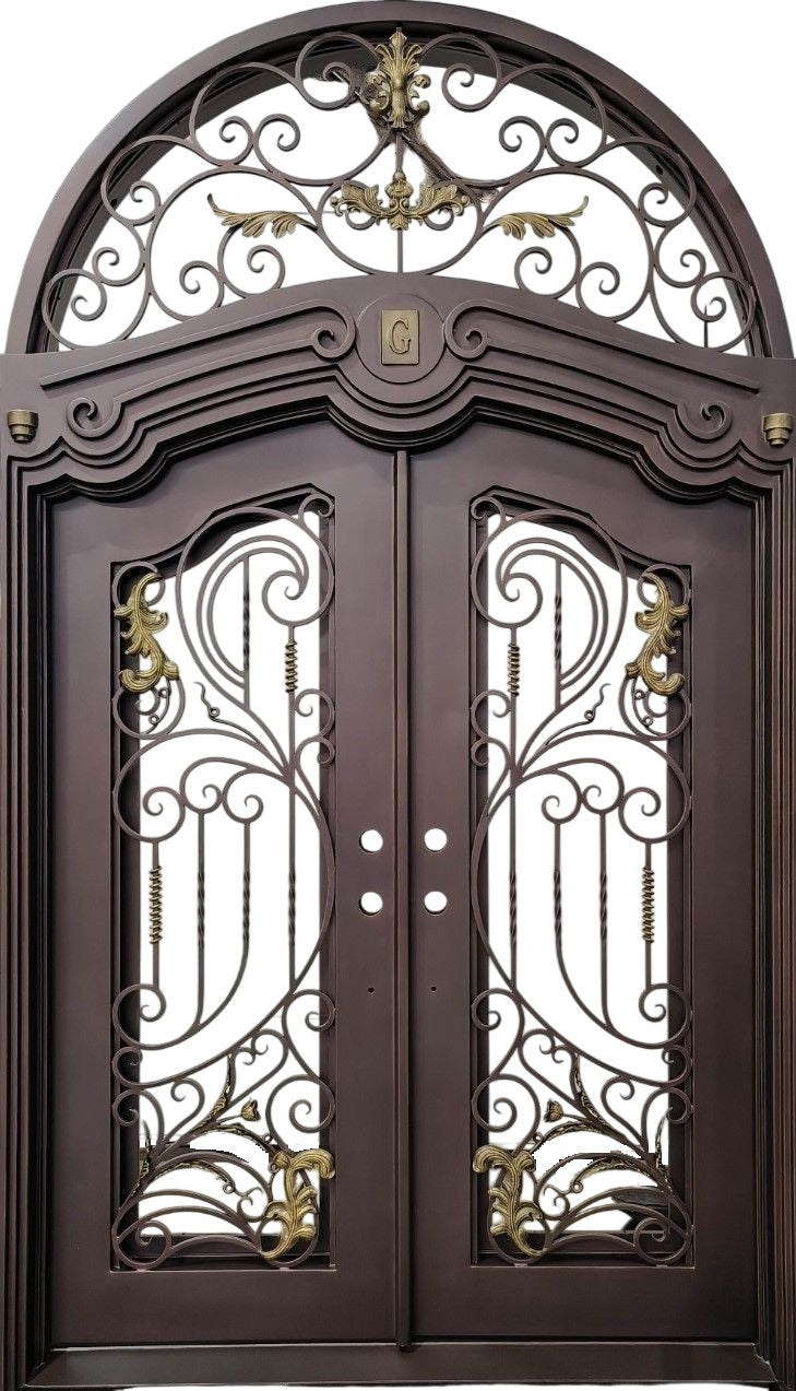 Turn your entrance into a statement piece with Model IWD 1020 — a luxury wrought iron double door featuring gold-accented scrollwork, arched transom, and personalized monogram styling. Designed for elegance and engineered for strength, this handcrafted iron door is ideal for upscale homes and commercial properties that demand prestige. Weather-resistant finishing and insulated frames ensure long-term performance, while customizable specs let you tailor the look to your project vision.