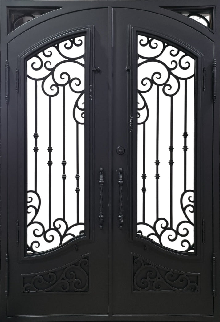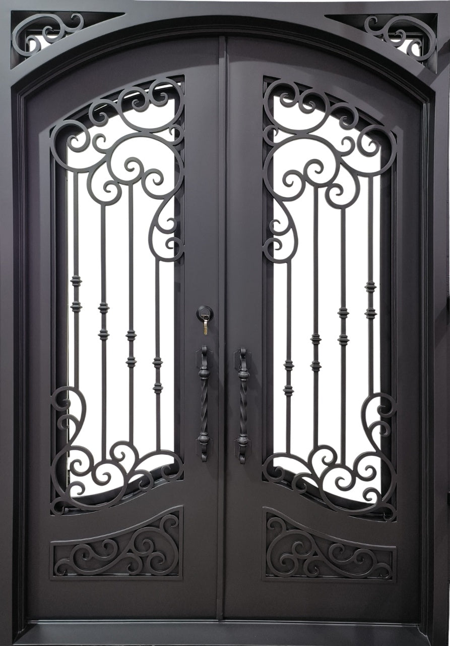 Model IWD 941 is a handcrafted arched wrought iron double door showcasing flowing scroll panels and dual circular medallions per leaf. Matte black powder-coated for all-season durability and foam-filled for energy performance, this design blends ornamental heritage with customizable precision. Suited for luxury homes and heritage renovations, it delivers elegance, balance, and long-term resilience.