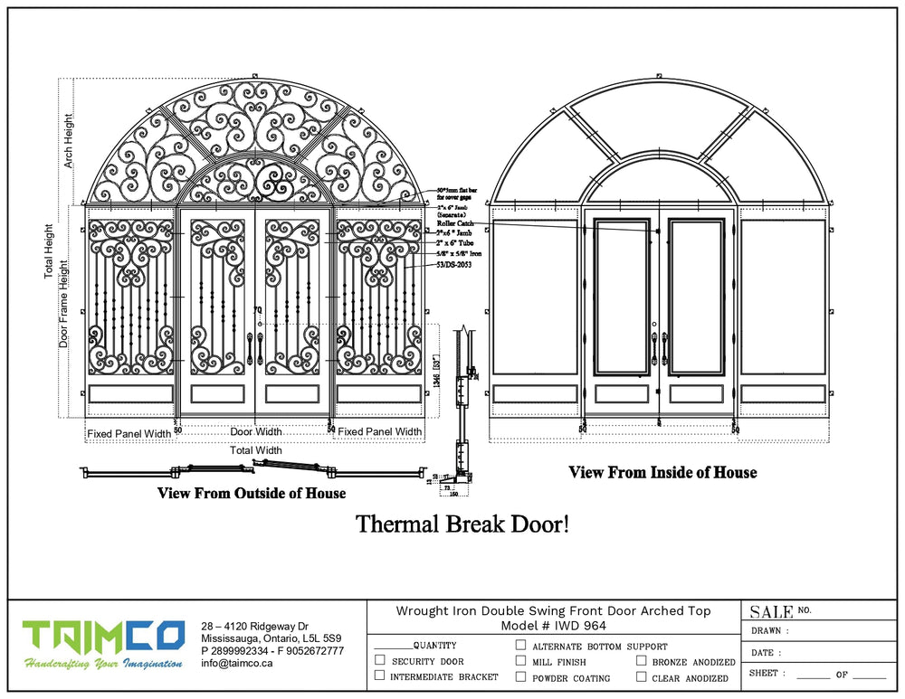Command attention with Model IWD 964, a premium arched wrought iron double door that fuses ornamental design with structural integrity. Its top arch flows seamlessly into decorative scrollwork forged from 5/8" solid steel, accenting semi-transparent double-pane glass inserts that provide daylight while preserving privacy. Framed in insulated, powder-coated galvanized steel, this Canadian-made entry system offers timeless curb appeal with modern performance. Whether gracing a traditional façade or a contemporary villa, this model blends warmth, security, and style.
