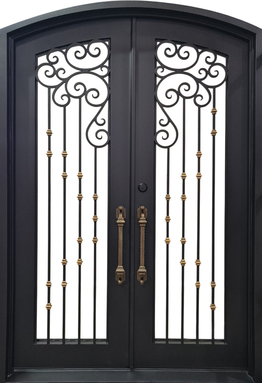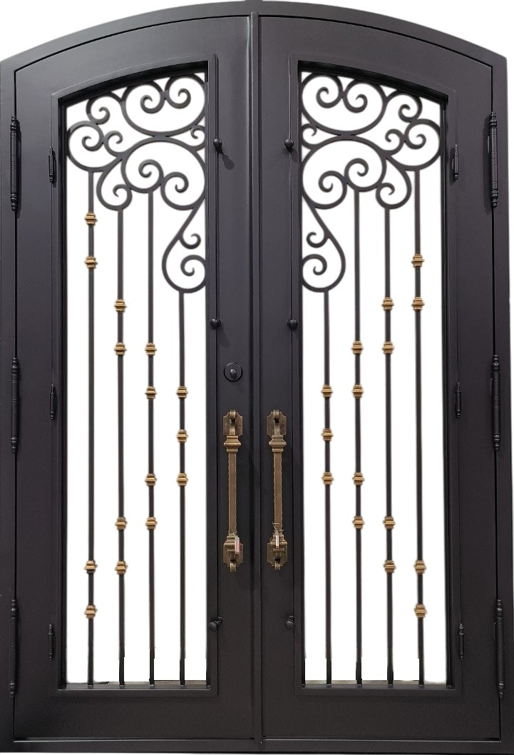 Arched Wrought Iron Double Entry Doors with Vertical Scroll Bar Detailing and Gold Accents Model IWD 959