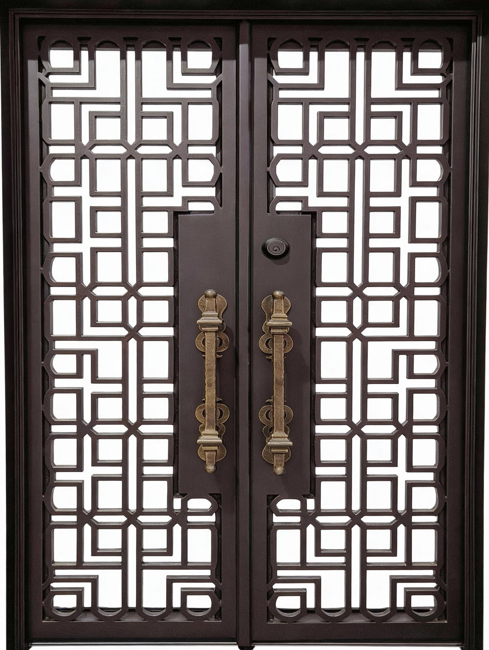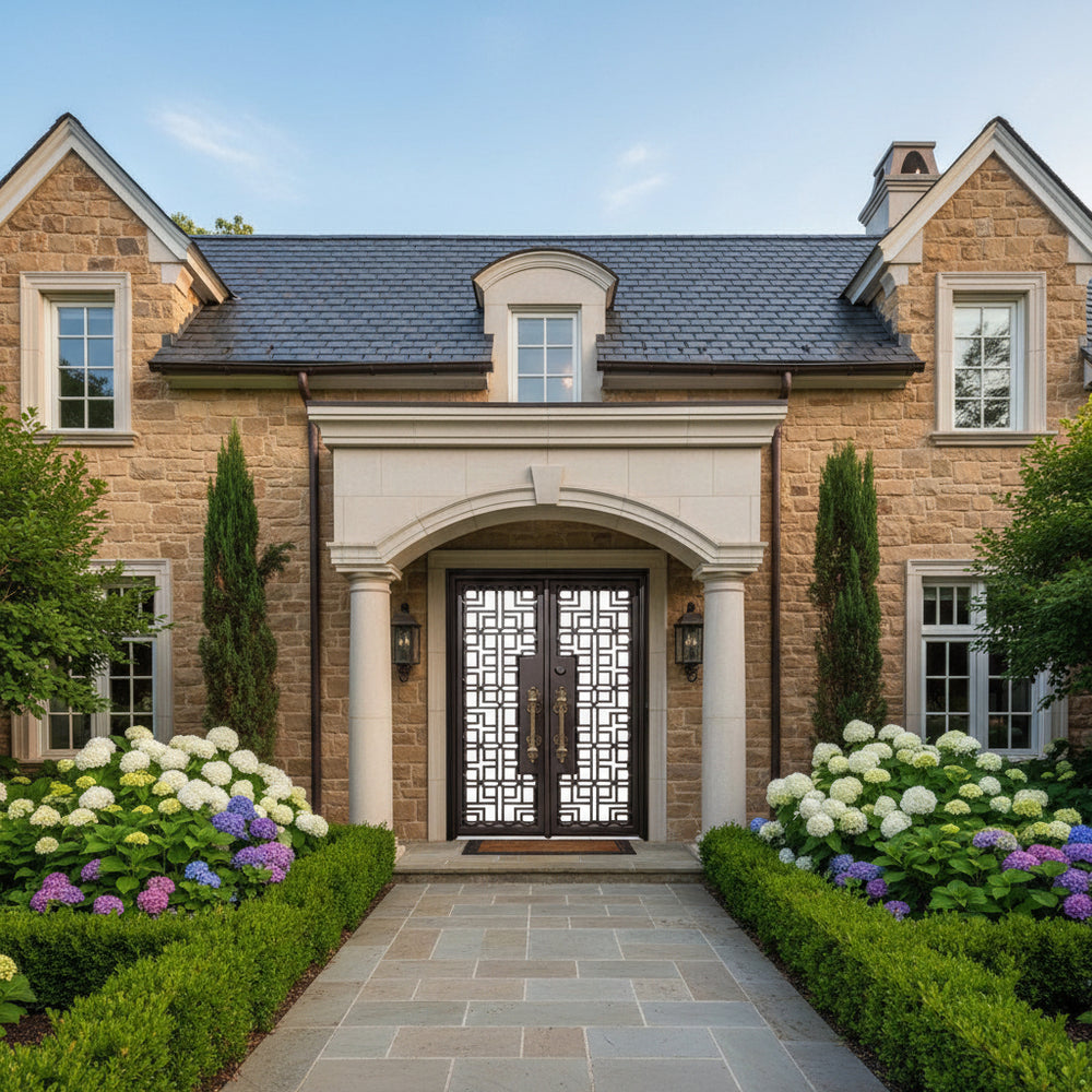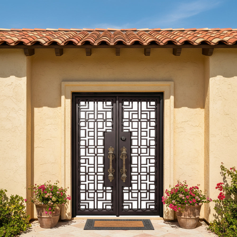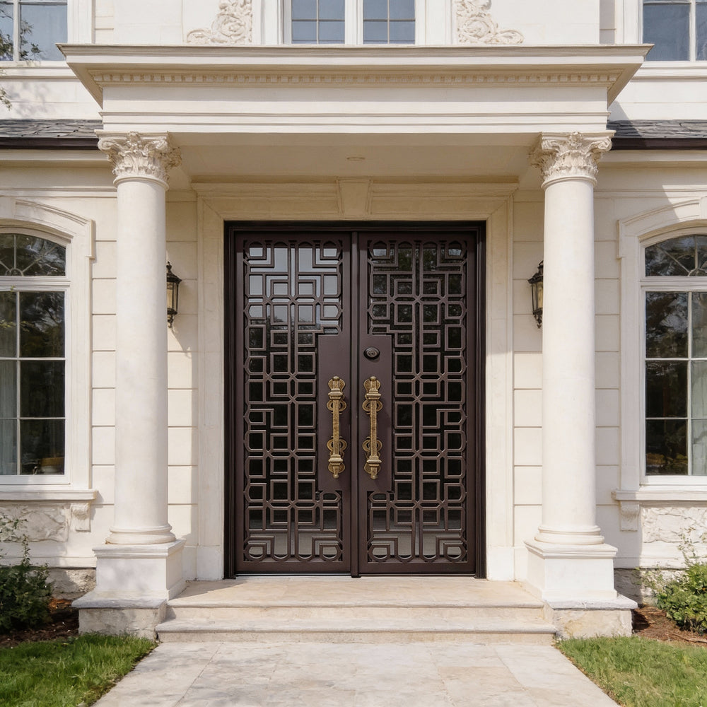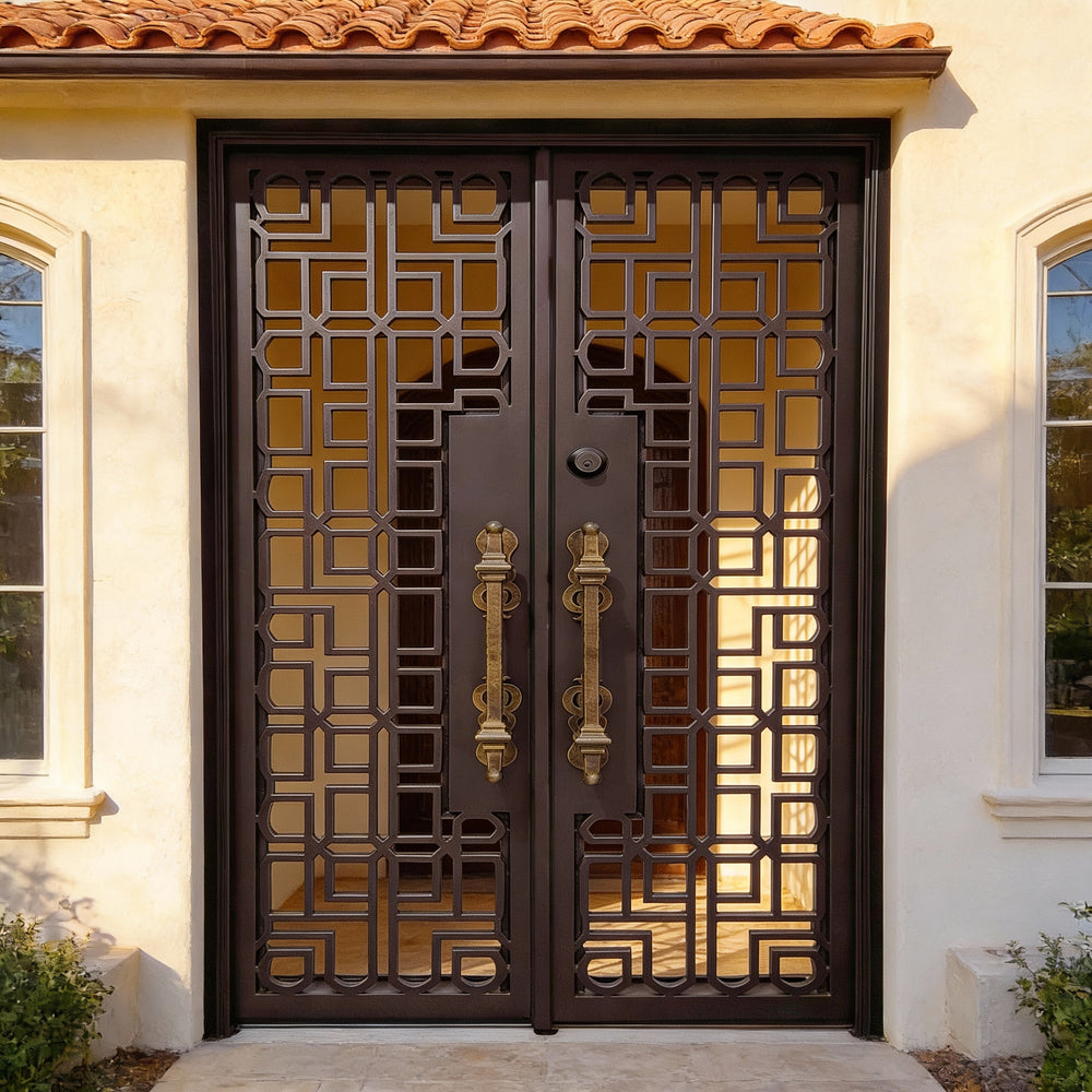 Add a dramatic architectural statement to your home’s entryway with Model IWD965, a gracefully arched wrought iron double door designed for timeless elegance and modern resilience. Featuring ornamental scrollwork forged from 5/8" solid steel and set behind frosted double-pane glass panels, this door offers both visual allure and privacy. Galvanized and powder-coated in matte black, it's built to withstand the elements while elevating curb appeal. Perfect for estate homes or upscale renovations, this model blends beauty, durability, and energy efficiency in one commanding centerpiece.