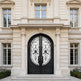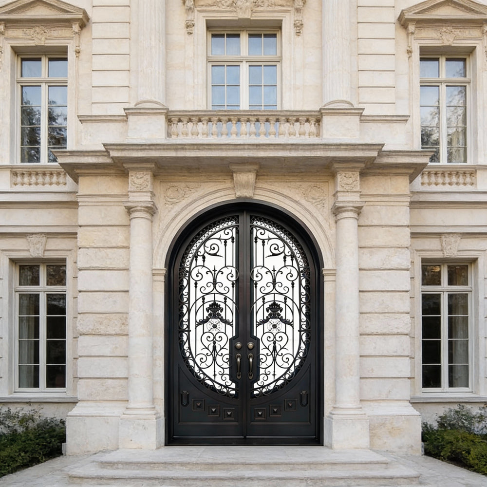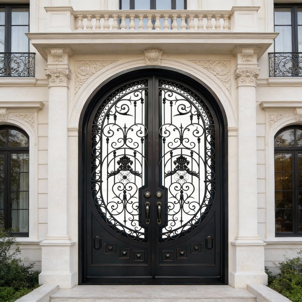 Add timeless elegance to your home’s entrance with Model IWD899, a beautifully arched wrought iron double door that blends ornamental design with durable craftsmanship. Each door leaf showcases classic scrollwork forged from solid steel, paired with operable 5/8" thick double-pane glass inserts that invite natural light while preserving privacy. This pre-hung unit features insulated 2” x 6” steel jambs, weatherstripping, and corrosion-resistant powder-coated finishes for all-season performance. Whether you're renovating a heritage home or designing a luxury façade, this model offers standout visual appeal and structural excellence.