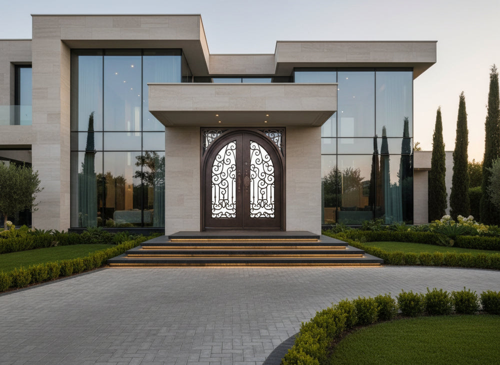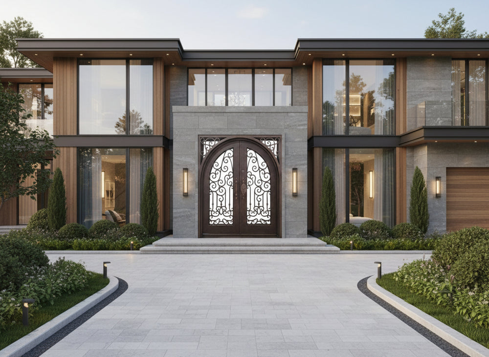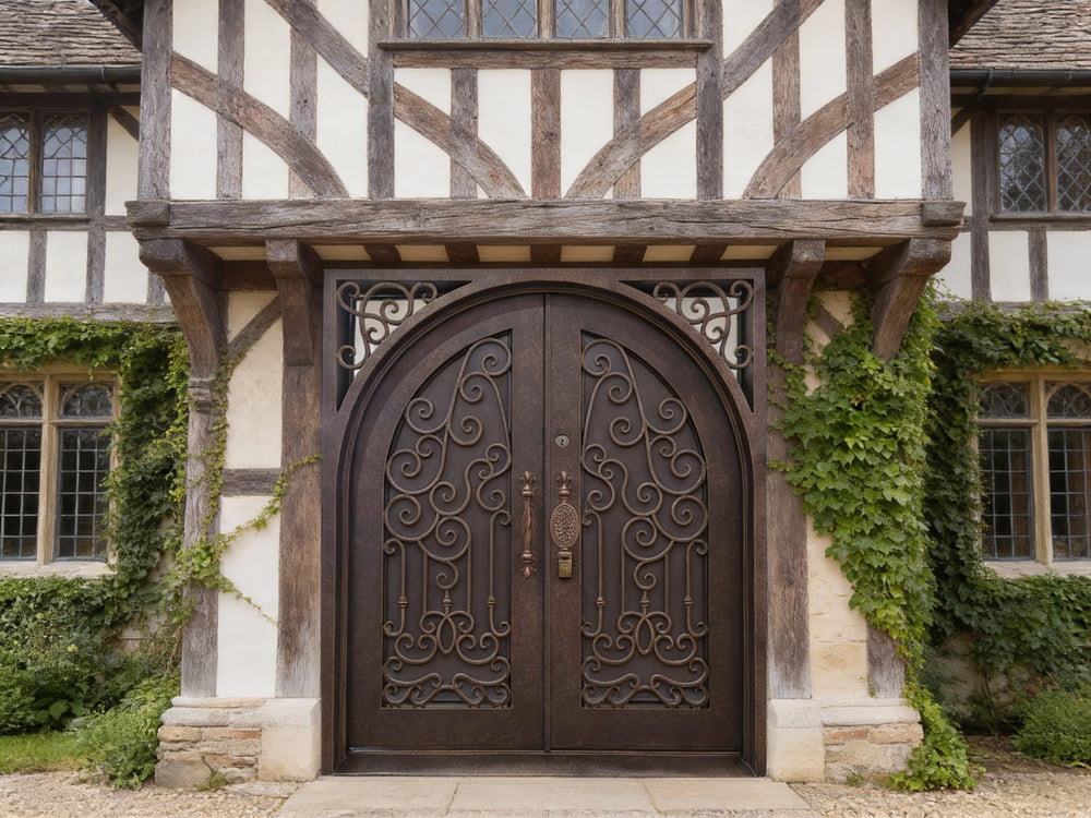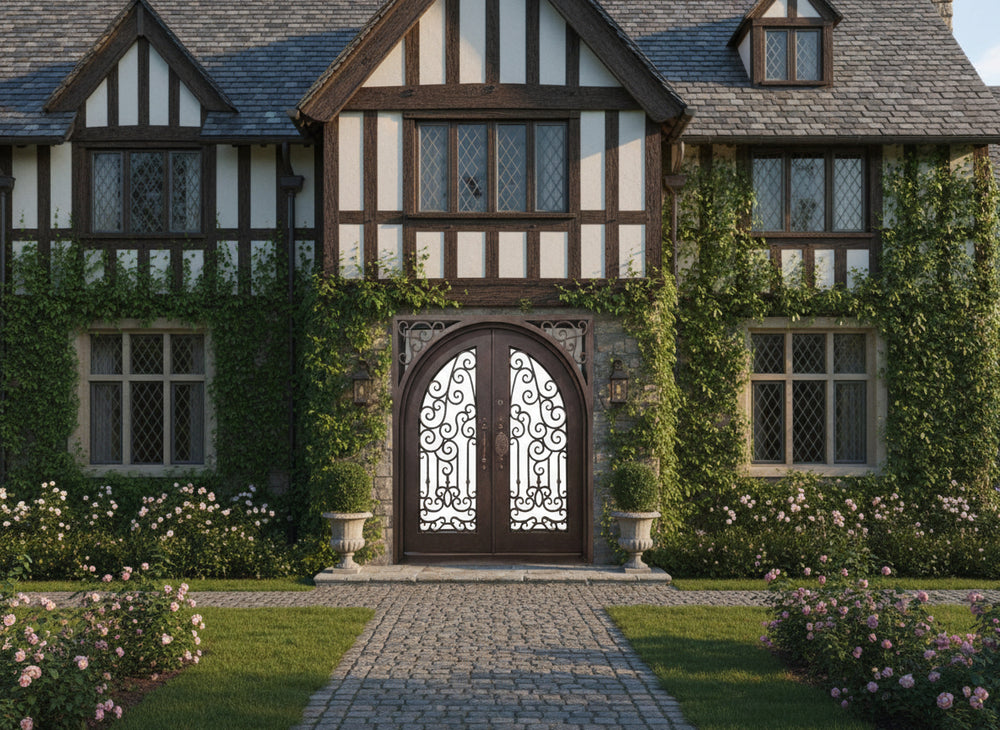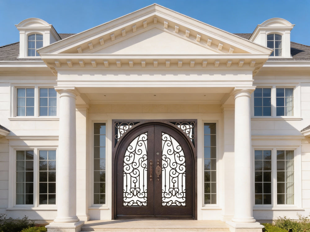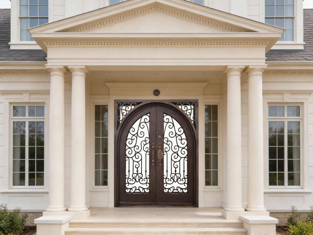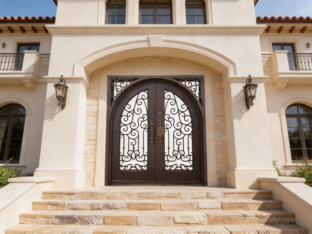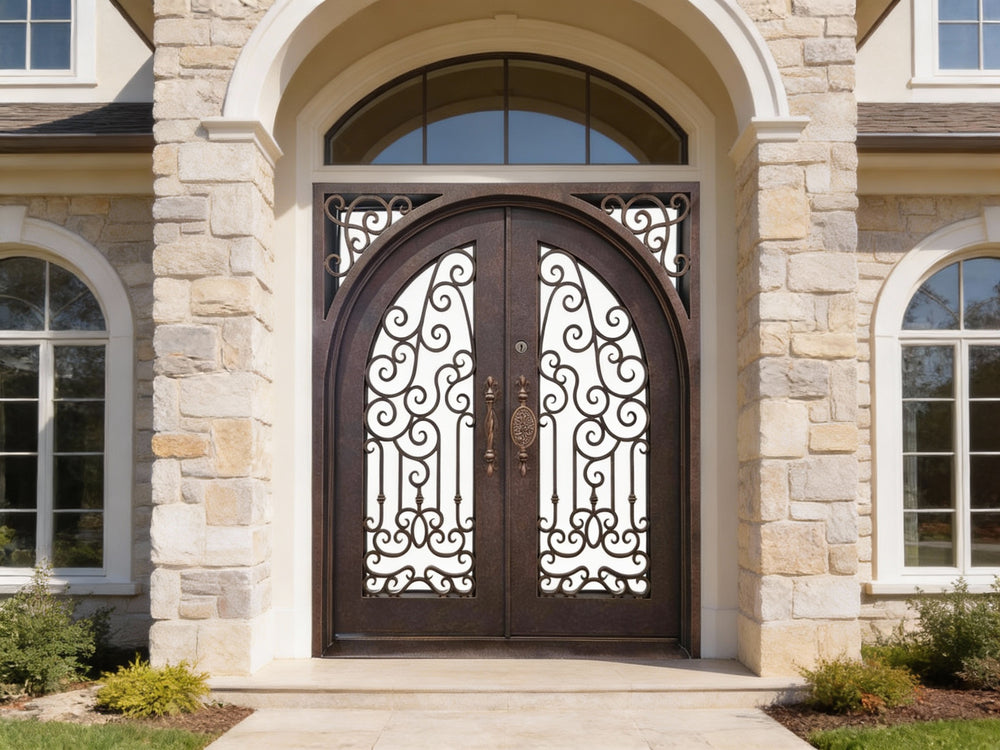 Upgrade your main entrance with ornamental wrought iron doors in Mississauga, Model IWD1027, featuring arched design, scroll detailing, and a built-in kickplate for added resilience. Perfect for custom iron front doors, estate-style entrances, and architectural metal upgrades, this model combines artistic flair with engineered strength. Whether you're listing for premium residential builds, durable exterior iron doors, or classic scrollwork entryways, this design meets style and substance with seamless craftsmanship.