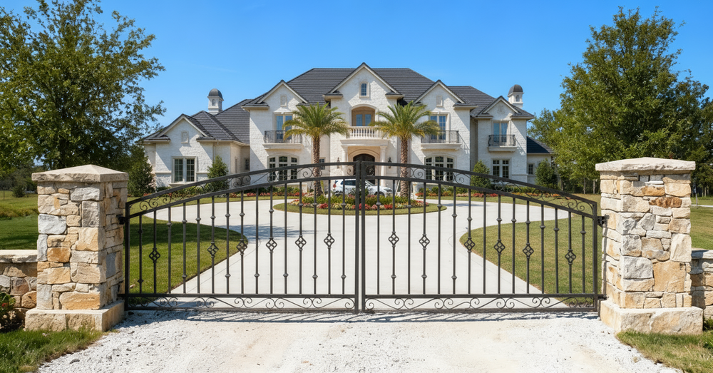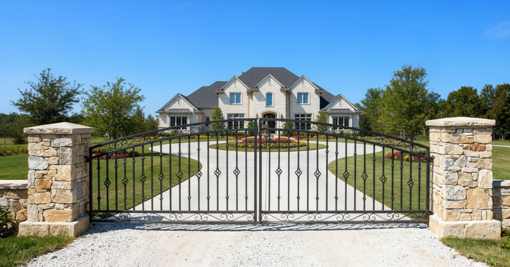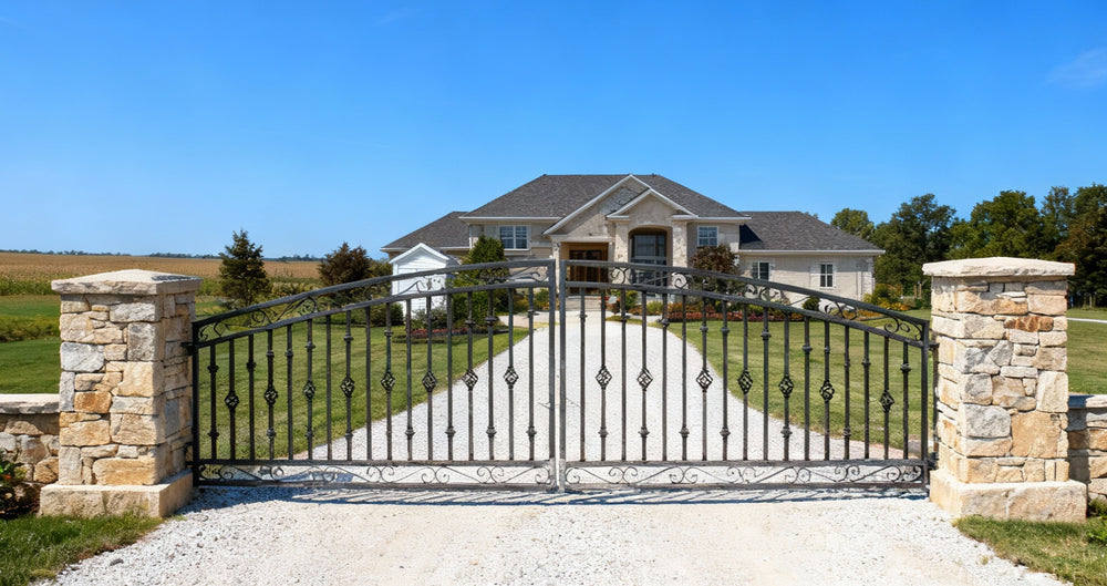 wrought iron arched gate, ornamental estate driveway gate, custom metal entrance gate Canada, scrollwork gate design, heritage home gate, stone pillar gate, heavy-duty classic gate