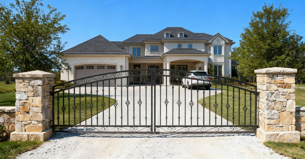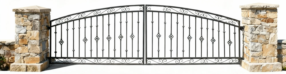 Make a refined entrance with Arche line Heritage, a wrought iron driveway gate featuring a graceful arched silhouette, vertical bars, and ornamental scrollwork. Framed by rugged stone pillars and topped with flat caps, this gate offers both security and sophistication—perfect for traditional homes, garden estates, or properties that value timeless design.
