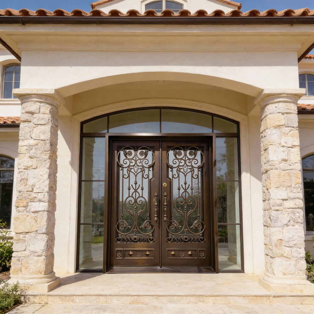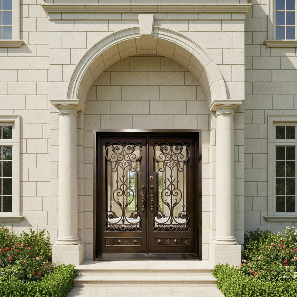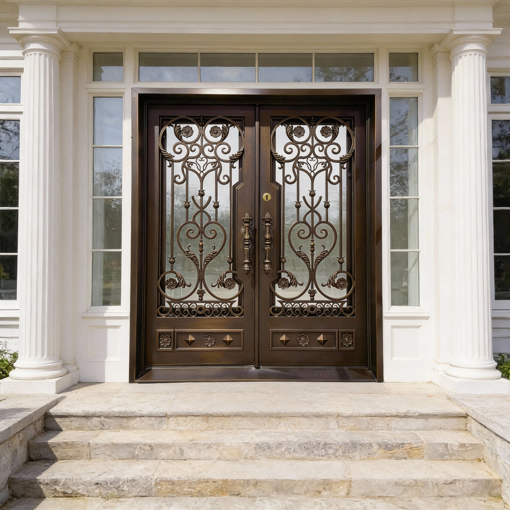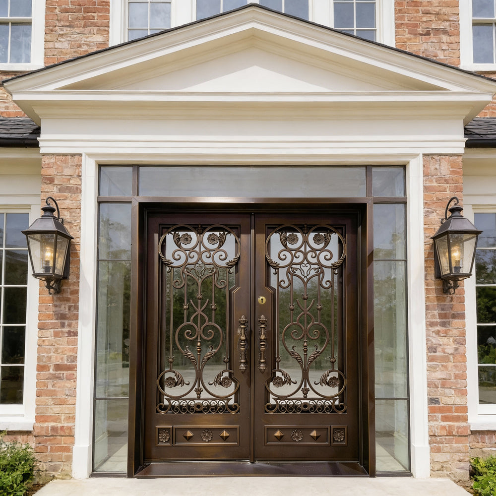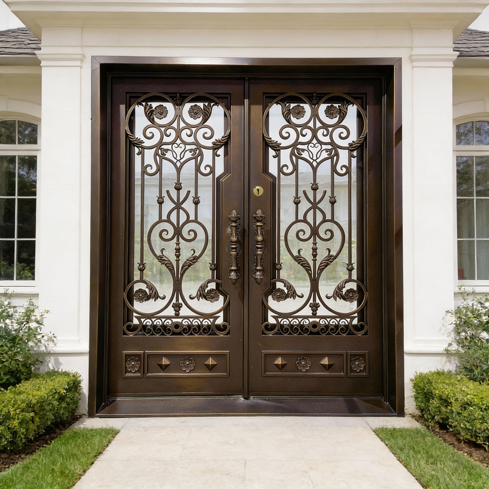 Model IWD1047 features a stunning double-door layout designed to elevate traditional and upscale entrances. With its hand-forged scrolls, floral medallions, and geometric lower panels, this door blends fine artistry with architectural robustness. Constructed from hot-dipped galvanized steel and protected by a powder-coated finish, it offers long-term durability and rust resistance. Dual insulated glass inserts enhance thermal efficiency, while the built-in kickplate reinforces function without compromising design.