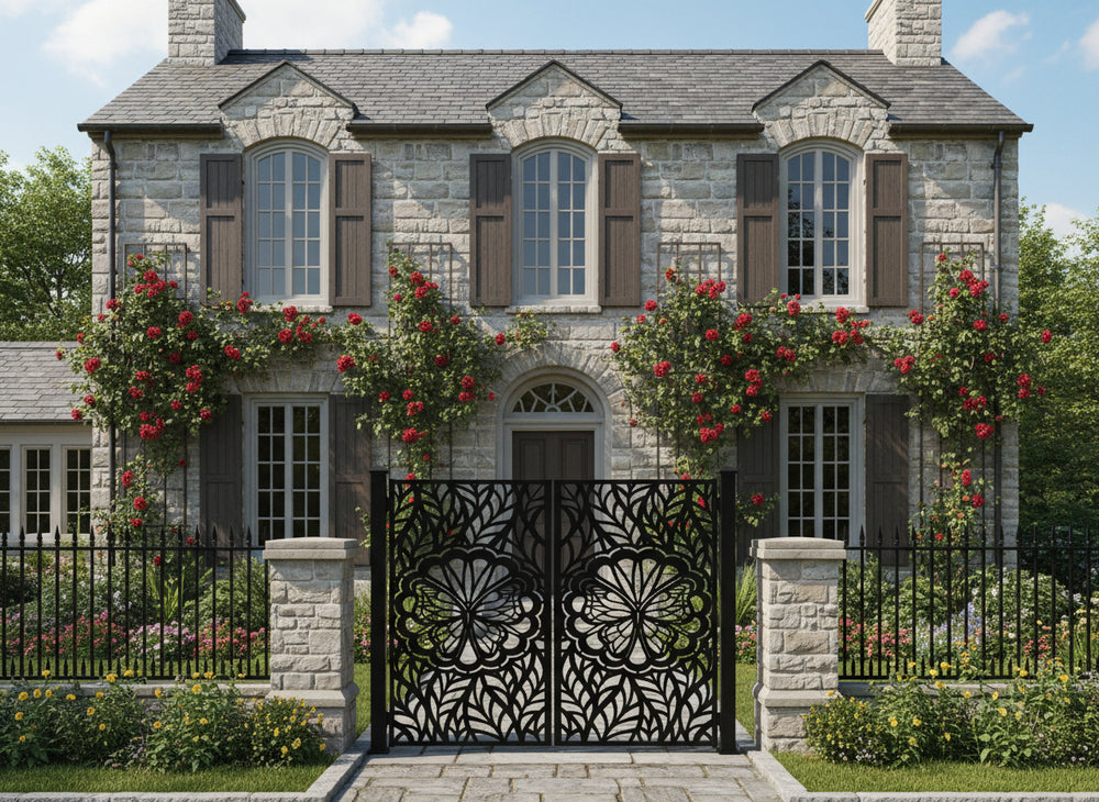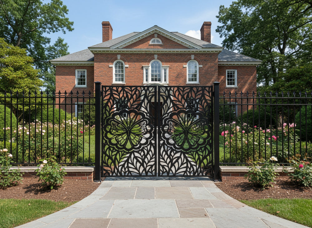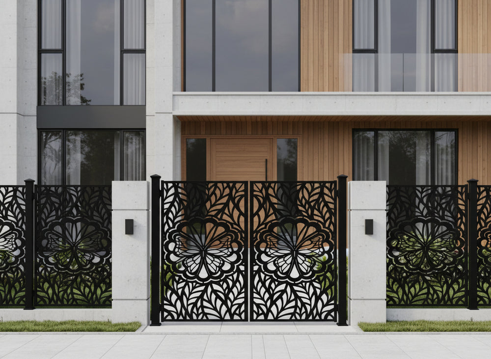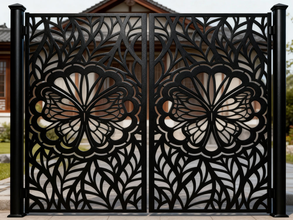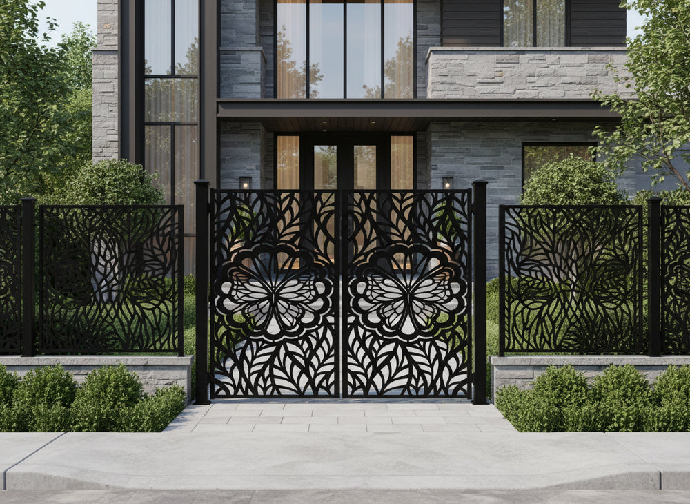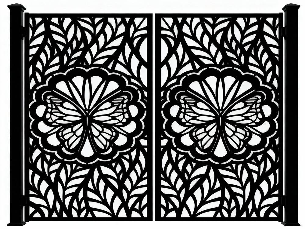 A door that dances with nature. Floraflight Passage features two symmetrical panels, each centered around a stylized butterfly surrounded by flowing floral and leafy scrollwork. The intricate laser-cut detailing creates a dynamic interplay of light and shadow, ideal for garden entries, courtyard transitions, or ornamental boundaries that celebrate transformation, elegance, and botanical artistry.