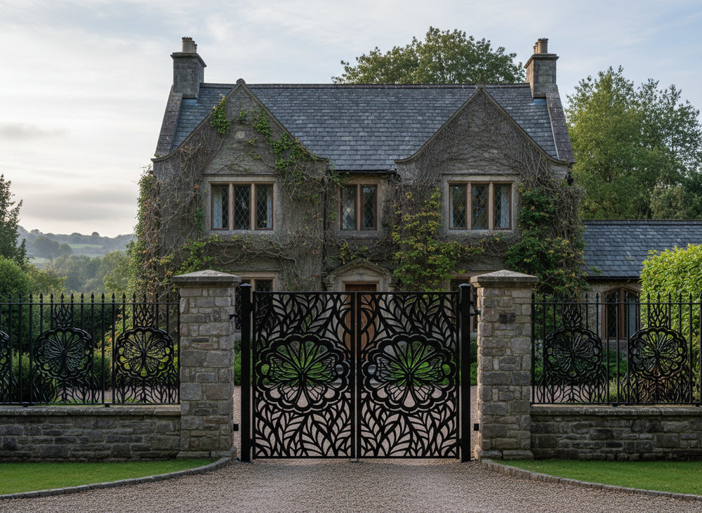 butterfly floral man door, ornamental scroll metal gate, nature-inspired garden entry, Canadian custom gate, Taimco decorative passage door, manual operation estate gate