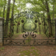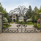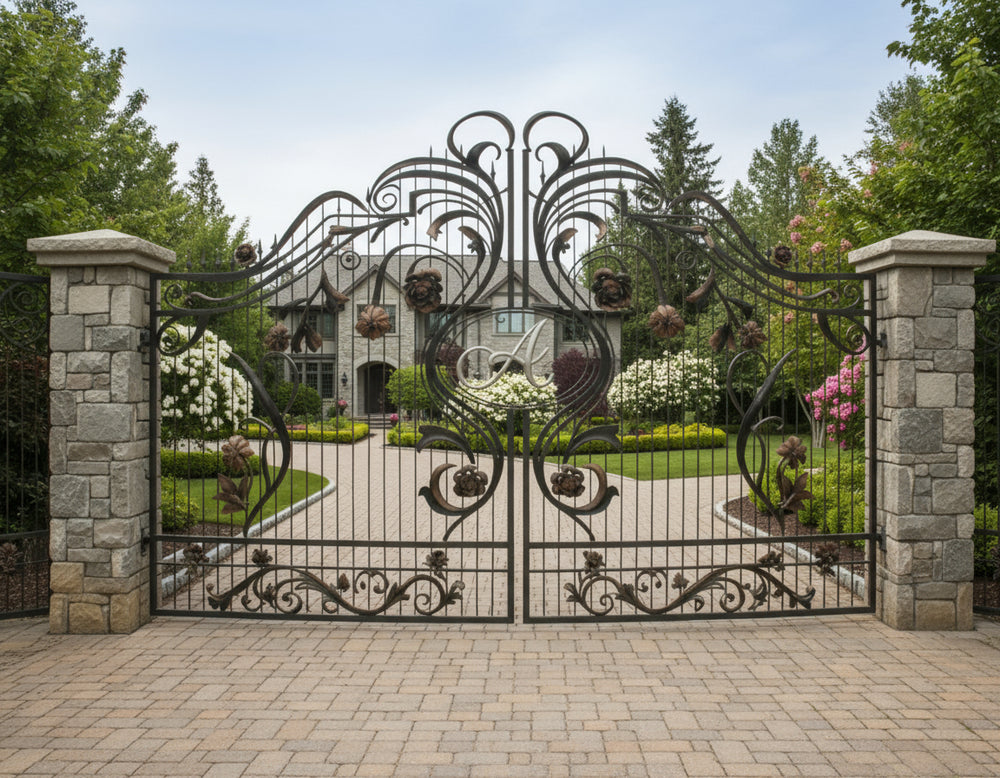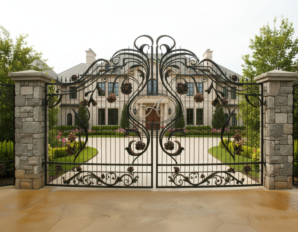 monogram driveway gate, scrollwork wrought iron gate, custom steel entrance gate, Canadian luxury gate, Taimco decorative gate, bronze accent estate gate, heavy-duty artistic gate, personalized home gate design