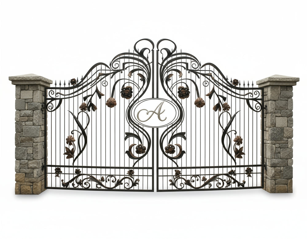 A gate that bears your mark. Aurelian Crest features dual swing panels adorned with flowing scrollwork and floral flourishes, crowned by a central circular emblem showcasing the letter “A”—a bold declaration of ownership, artistry, and prestige. The bronze-toned accents shimmer against the matte black frame, while the flanking stone pillars anchor the design in classical strength. Perfect for estates that blend personal legacy with ornamental grandeur.