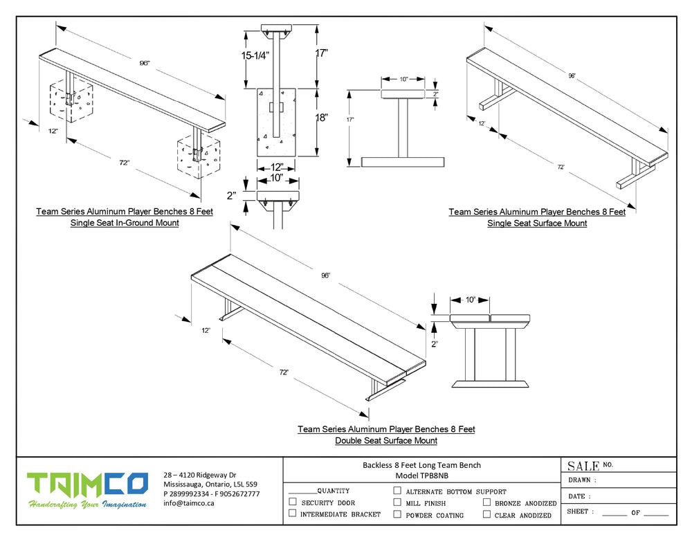 Taimco TPB8NB, aluminum player benches, backless benches, surface mount benches, in-ground mount benches, durable seating, sports benches, portable benches, galvanized hardware, and weather-resistant benches.