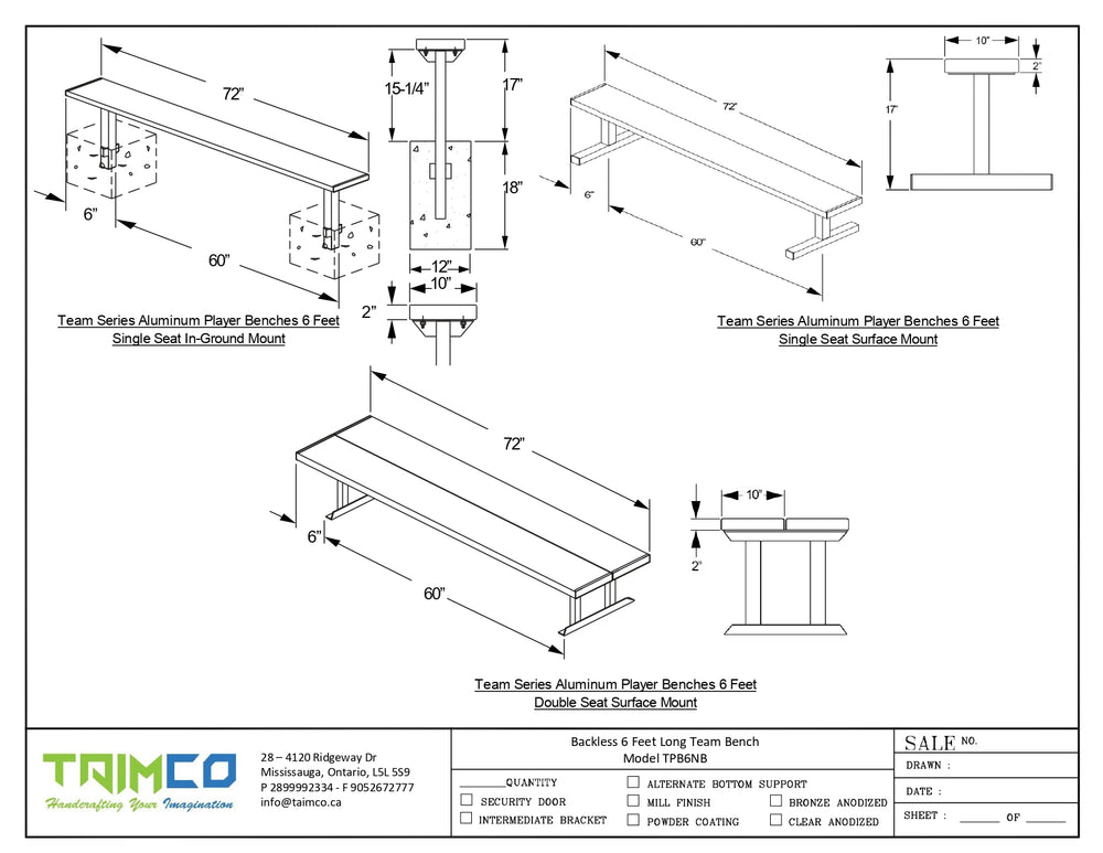 Taimco TPB6NB, aluminum player benches, backless benches, surface mount benches, in-ground mount benches, durable seating, sports benches, portable benches, galvanized hardware, and weather-resistant benches.