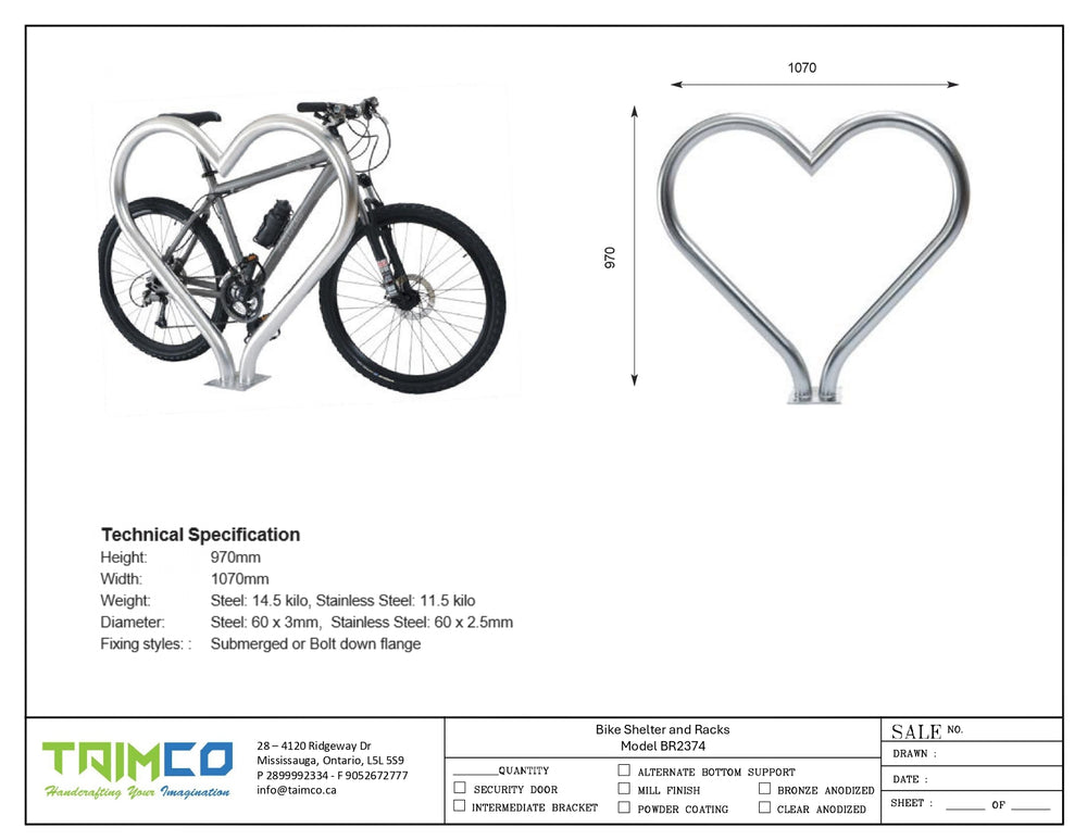 TAIMCO is a variation of the Rack with a touch of flair. Its graceful shape allows bicycles to be parked without twisting. it is offered in heavy-duty, round and square tubing.