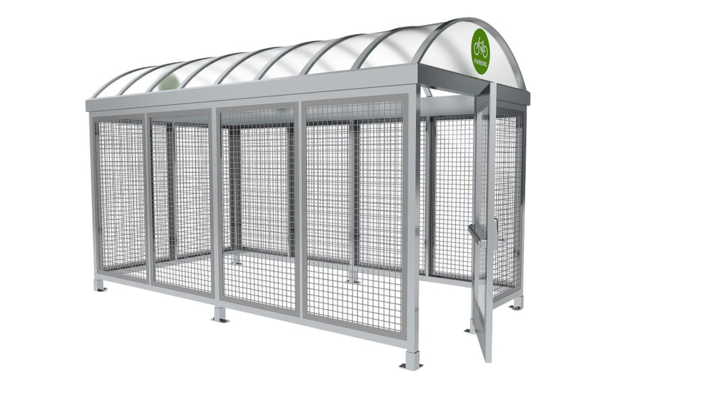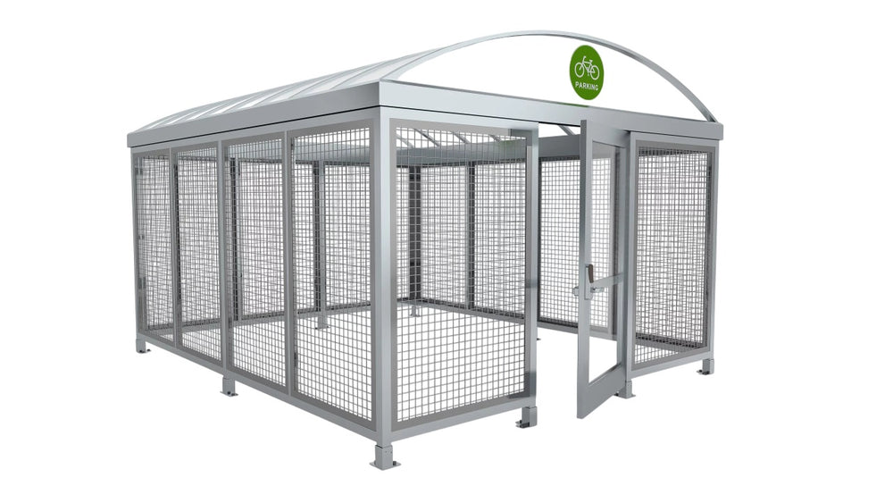 High-security bike shelter, Weatherproof bike shelter, Long-term bike parking, Rust-proof bike shelter, Anodized aluminum bike shelter, Shatterproof glass bike shelter, Vented barrel-vaulted roof, Secure bike storage, Outdoor bike shelter, Customizable bike shelter.