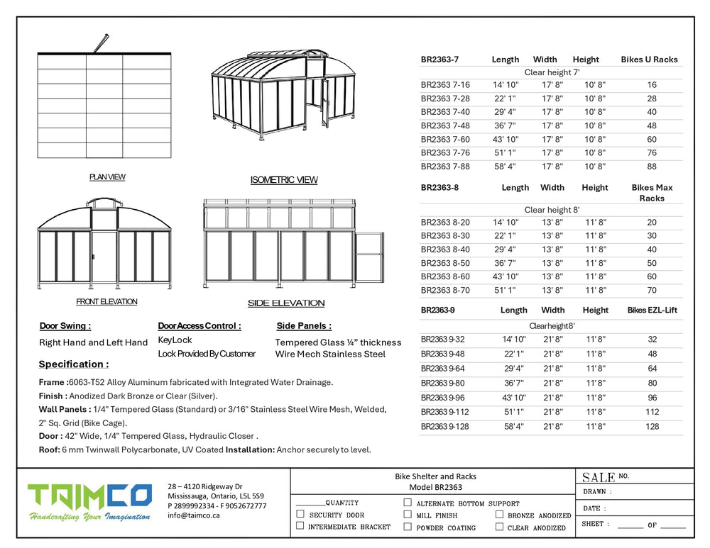 TAIMCO Guardian is a high-security, weatherproof bike shelter designed for long-term bike parking. Manufactured from rust-proof, anodized aluminum, shatterproof glass side panels, and a translucent, vented, barrel-vaulted roof, the Guardian's attractive design is ideal for environments where aesthetic considerations are just as important as functionality.