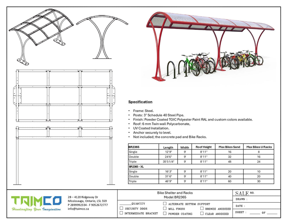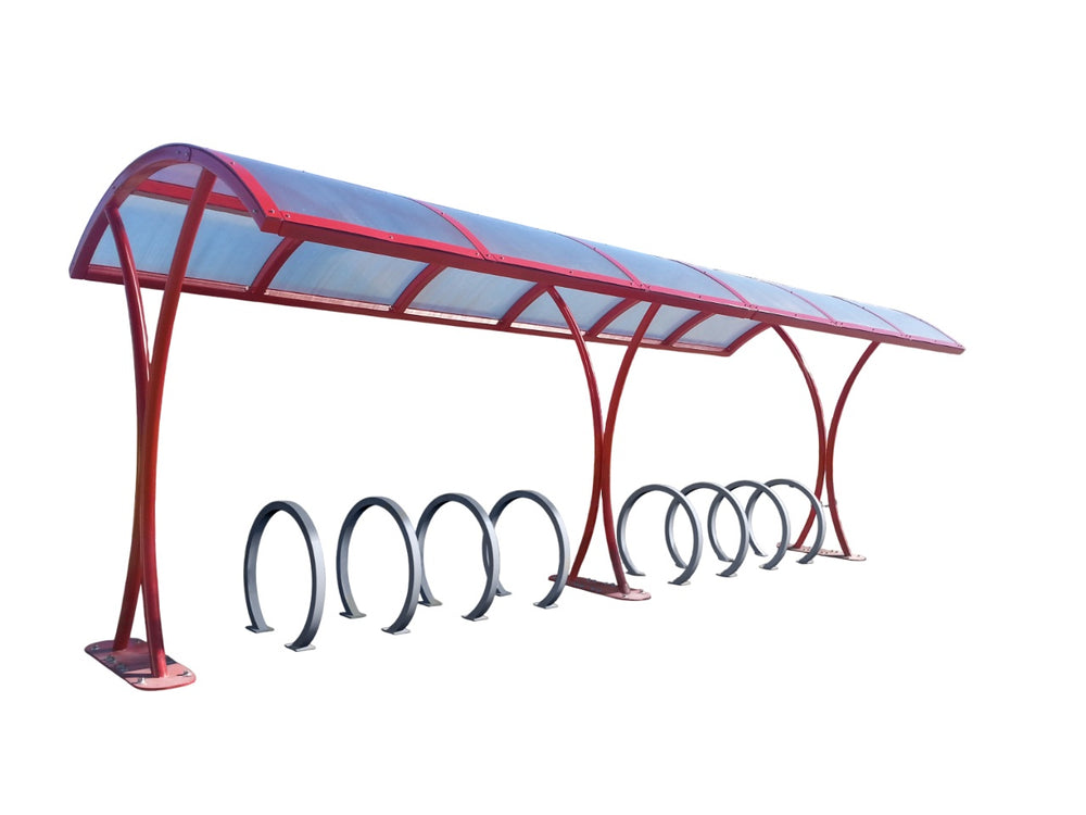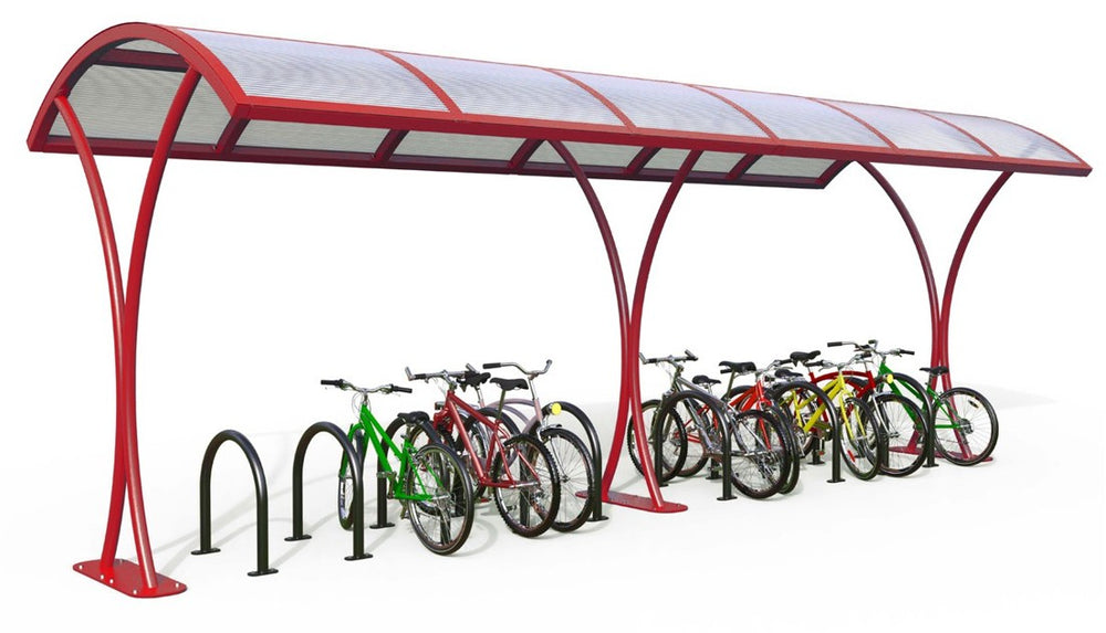 The TAIMCO is a stylish bicycle parking shelter with sweeping lines and a distinctive look. Its wide, translucent roof provides excellent coverage while maintaining a small footprint. Available in 12′ and 15-long models, its modular construction allows for economical expansion. Two-sided MaxRack Stands double the bike capacity.