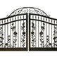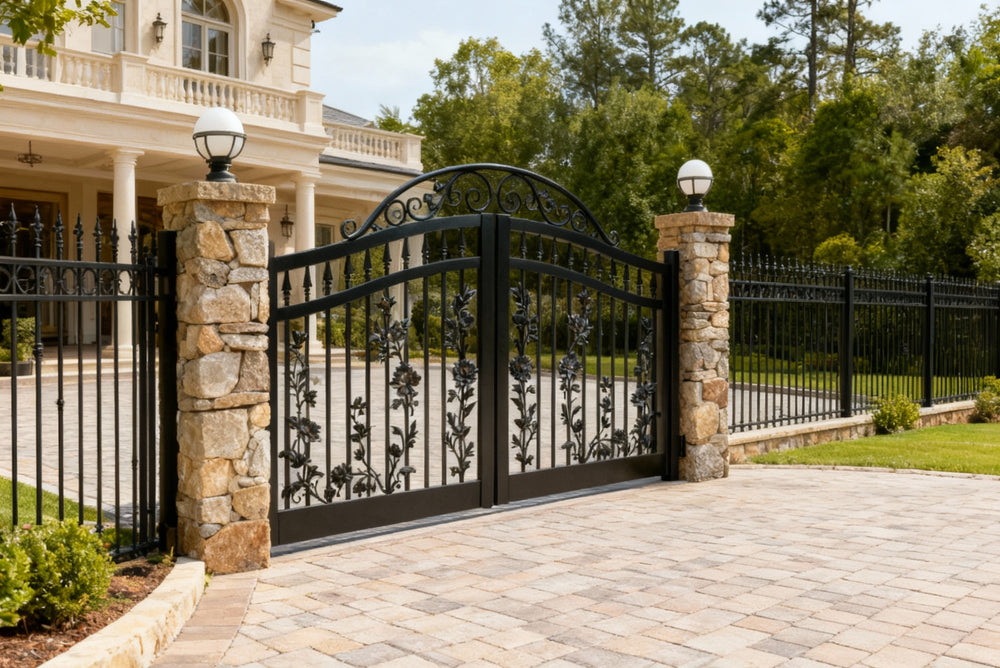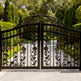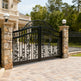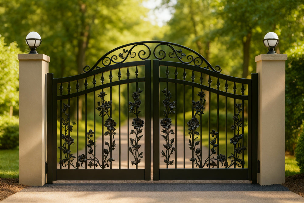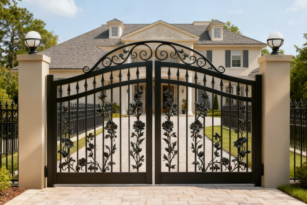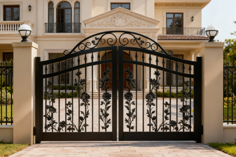 A gate that sings in silhouette. Birdsong Bloomgate features dual swing panels adorned with vertical bars, curling vines, and ornamental flowers. The arched top is crowned with delicate scrollwork and perched bird motifs, creating a whimsical canopy of motion and grace. Flanked by soft beige pillars topped with spherical lanterns, this gate evokes serenity, artistry, and timeless charm—perfect for garden entries, romantic estates, or nature-inspired homes.