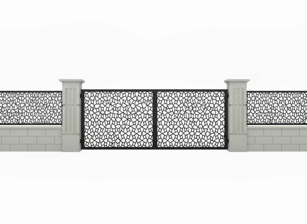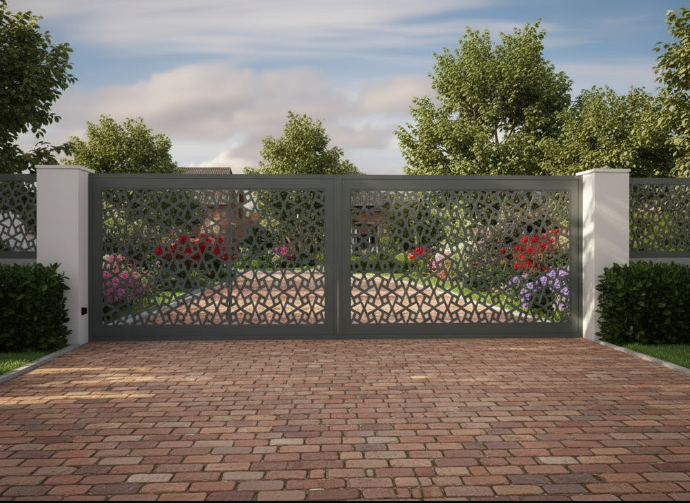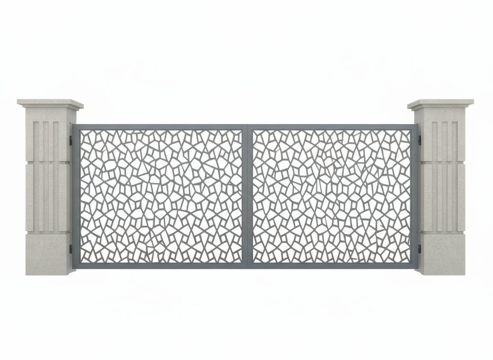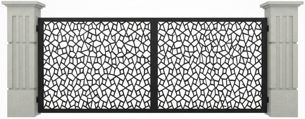 A gate that frames nature with nature. Branch line Vista features a plasma-cut pattern of intertwining branches or coral-like forms, offering both privacy and visibility. The organic design allows glimpses into the garden beyond—colorful flowers, sculpted hedges, and curated landscapes—while the matte black finish and clean framing deliver modern curb appeal. Flanked by vertical columns with embedded lighting, this gate transforms any entrance into a living canvas.