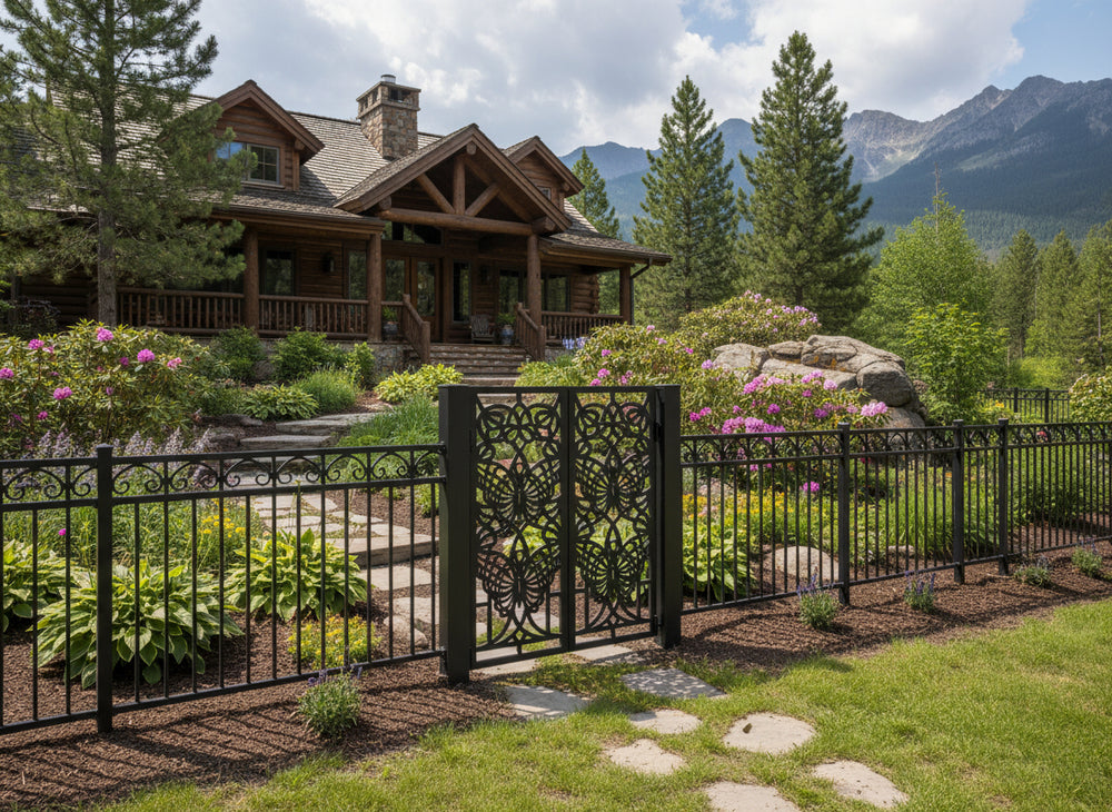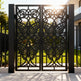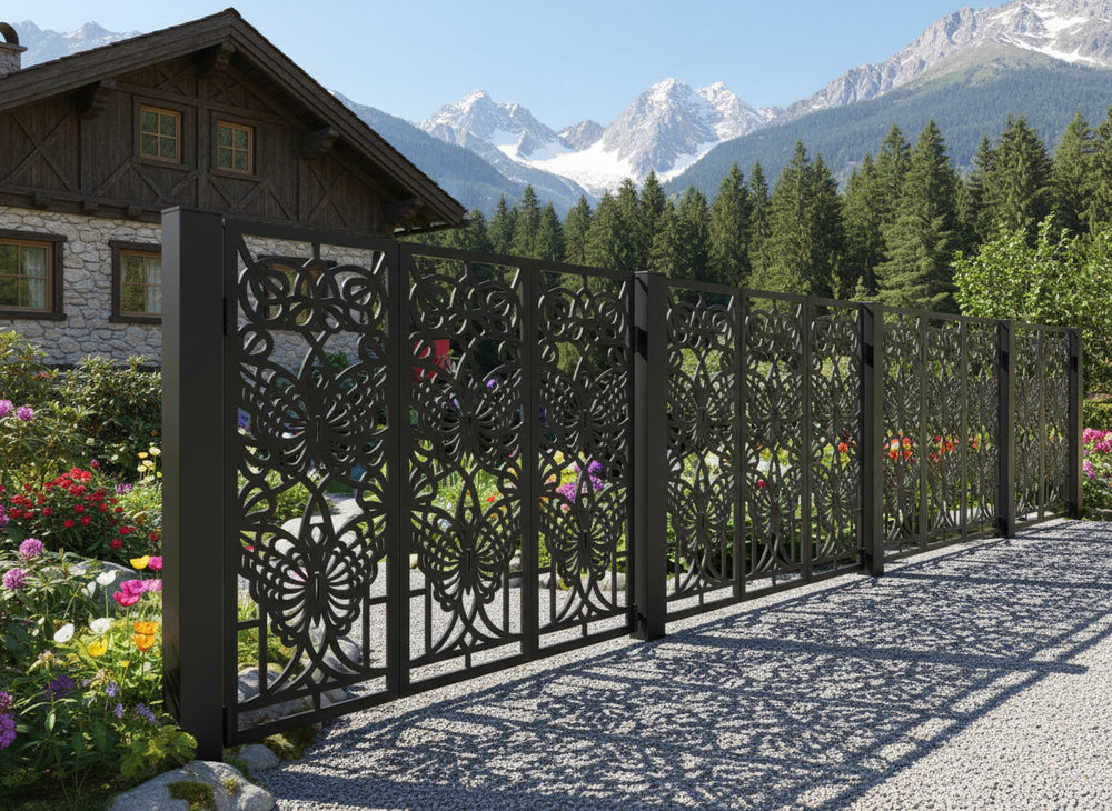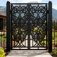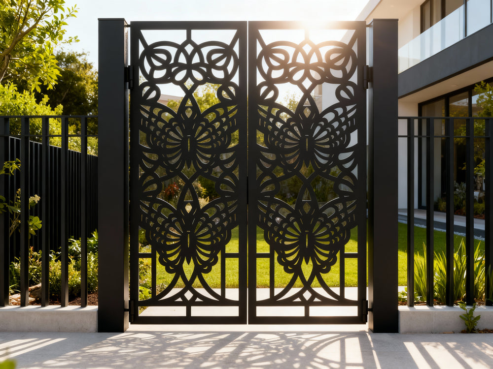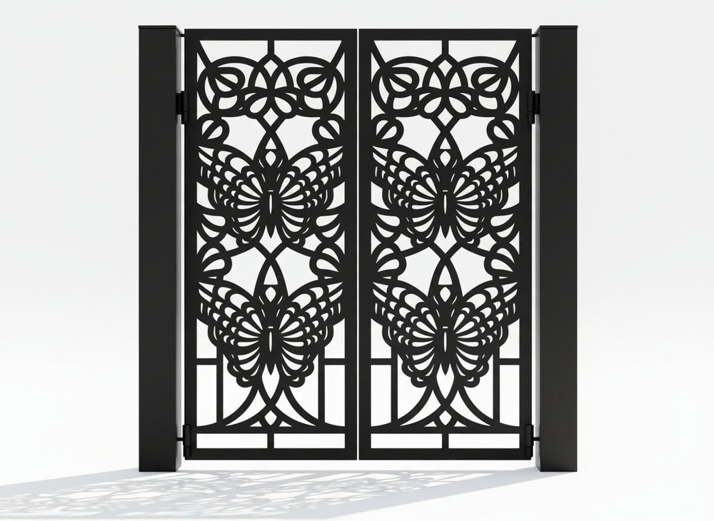 A door that flutters with finesse. Buttercrest Passage features two symmetrical panels, each centered around a stylized butterfly motif framed by abstract floral and geometric scrollwork. The laser-cut design offers both visual delicacy and bold contrast—ideal for garden entries, courtyard transitions, or decorative boundaries that celebrate transformation, nature, and artistic craftsmanship.
