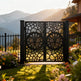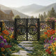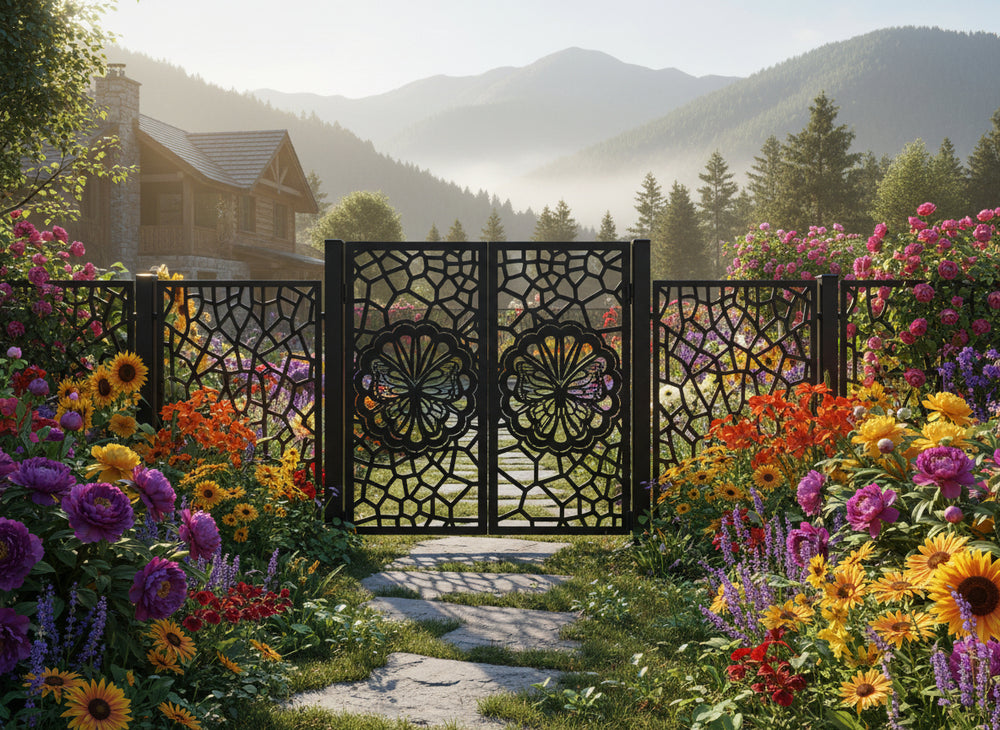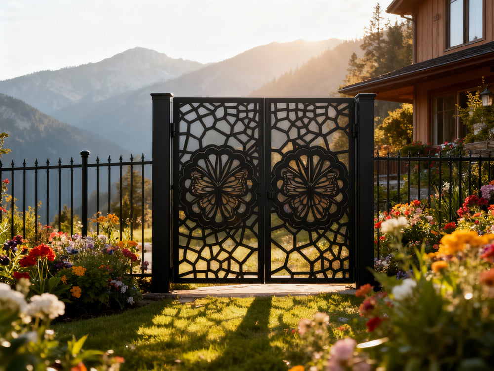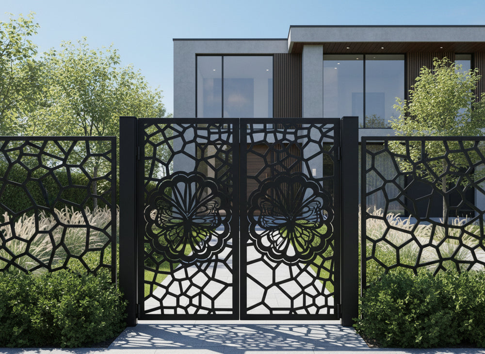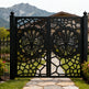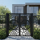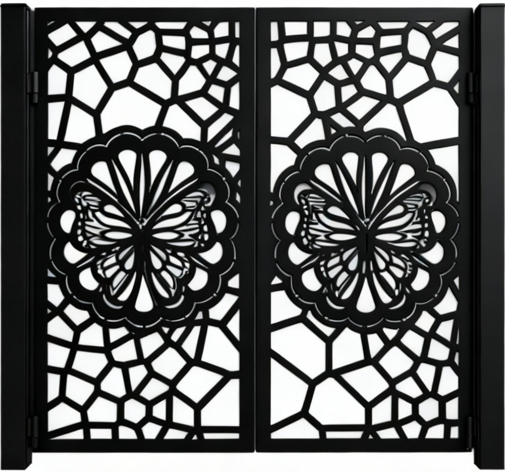 A door that celebrates symmetry and transformation. Buttermosaic Passage features two mirrored panels, each centred around a stylized butterfly enclosed in a scalloped circular frame. Surrounding the butterfly is a mosaic of irregular polygonal shapes, creating a stained-glass effect in metal. Ideal for garden entries, courtyard transitions, or artistic boundaries that blend nature’s grace with geometric precision.