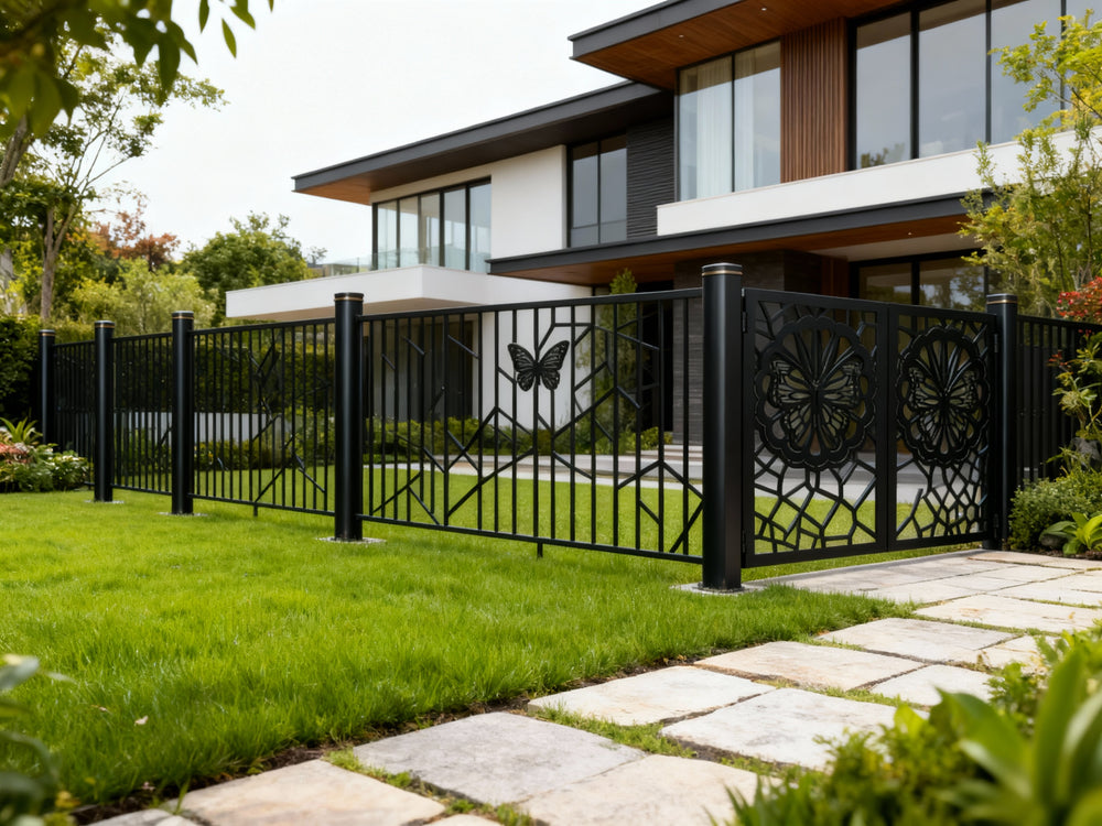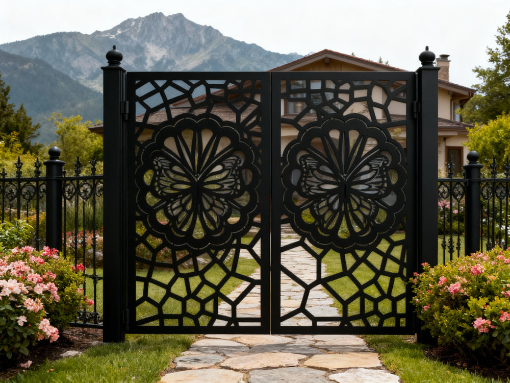 butterfly mosaic man door, scalloped medallion metal gate, geometric garden entry, Canadian custom gate, Taimco artistic passage door, manual operation estate gate