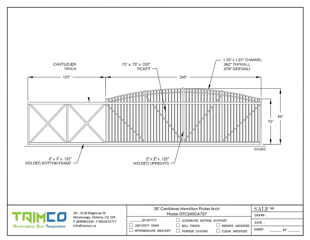 TAIMCO is committed to delivering high-quality, durable, and aesthetically pleasing gate solutions. The Fortress Box Frame Cantilever Slide Gate combines superior craftsmanship with advanced design to provide a reliable and attractive security solution for any property.