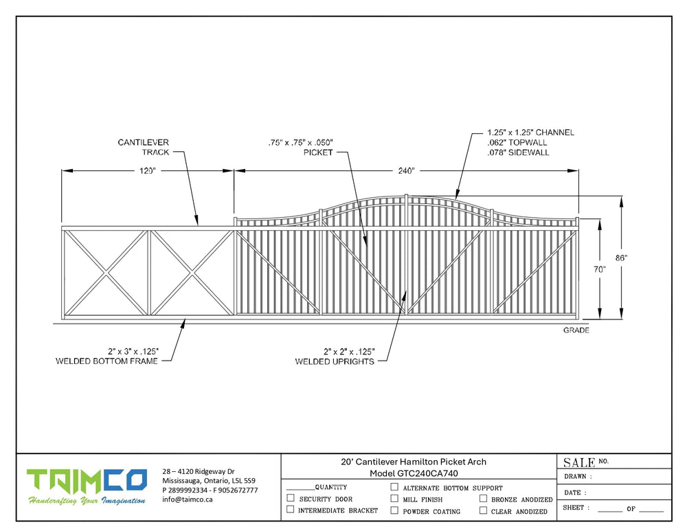 TAIMCO is committed to delivering high-quality, durable, and aesthetically pleasing gate solutions. The Fortress Box Frame Cantilever Slide Gate combines superior craftsmanship with advanced design to provide a reliable and attractive security solution for any property.