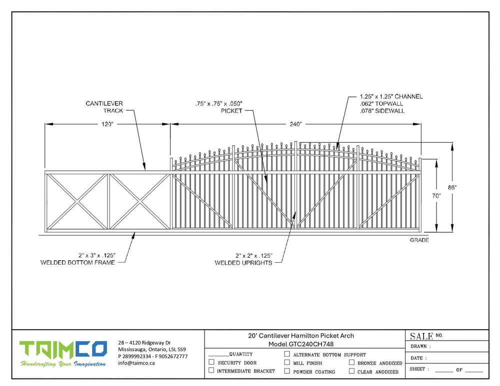 TAIMCO is committed to delivering high-quality, durable, and aesthetically pleasing gate solutions. The Fortress Box Frame Cantilever Slide Gate combines superior craftsmanship with advanced design to provide a reliable and attractive security solution for any property.