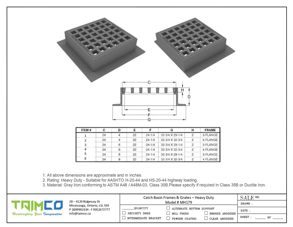 - Material: Gray Iron conforming to ASTM A48 I A48M-03, Class 30B. Please specify if required in Class 35B or Ductile Iron