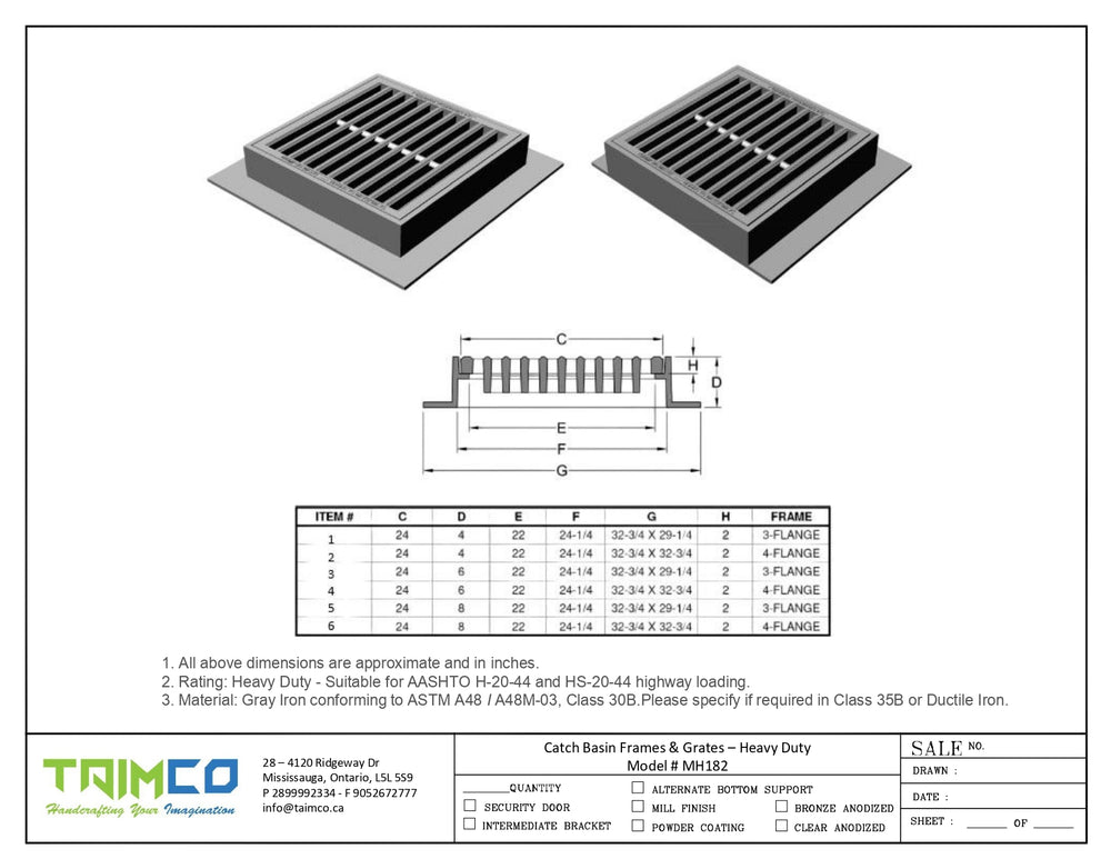 - Material: Gray Iron conforming to ASTM A48 I A48M-03, Class 30B. Please specify if required in Class 35B or Ductile Iron