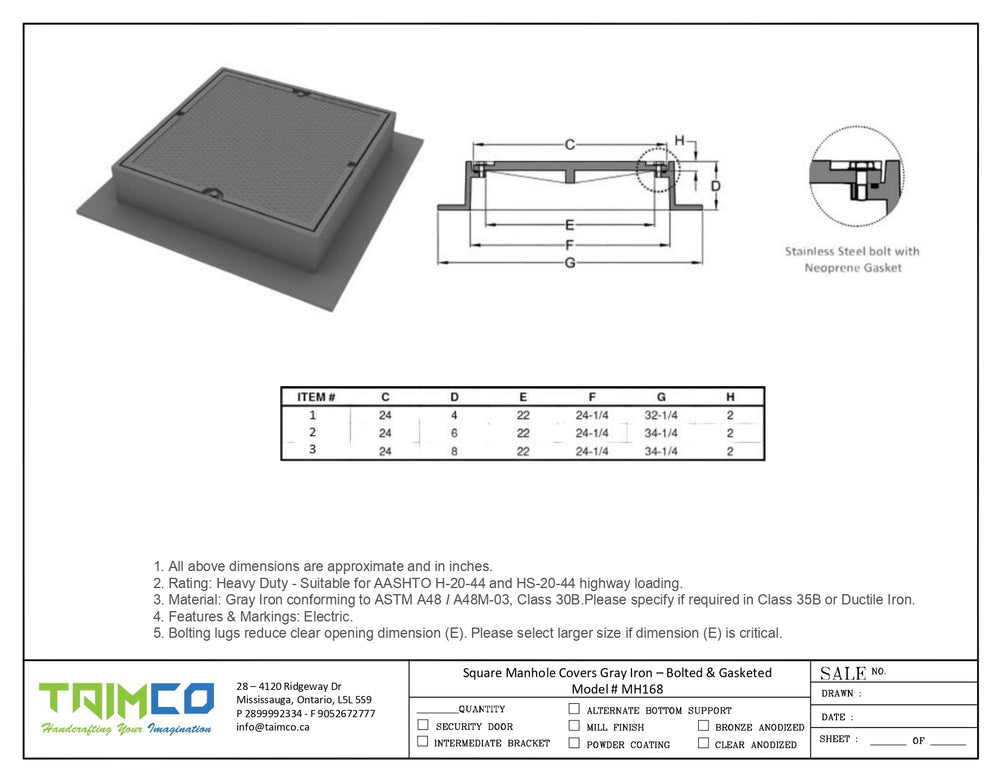 - Material: Gray Iron conforming to ASTM A48 I A48M-03, Class 30B. Please specify if required in Class 35B or Ductile Iron