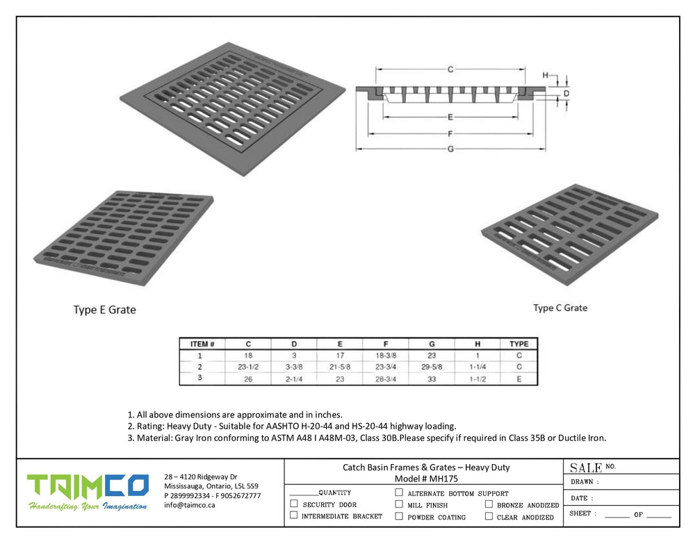 - Material: Gray Iron conforming to ASTM A48 I A48M-03, Class 30B. Please specify if required in Class 35B or Ductile Iron